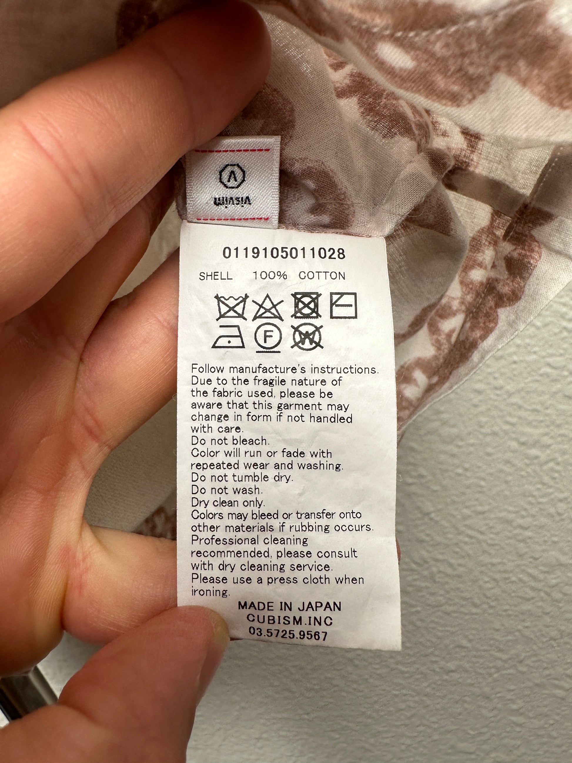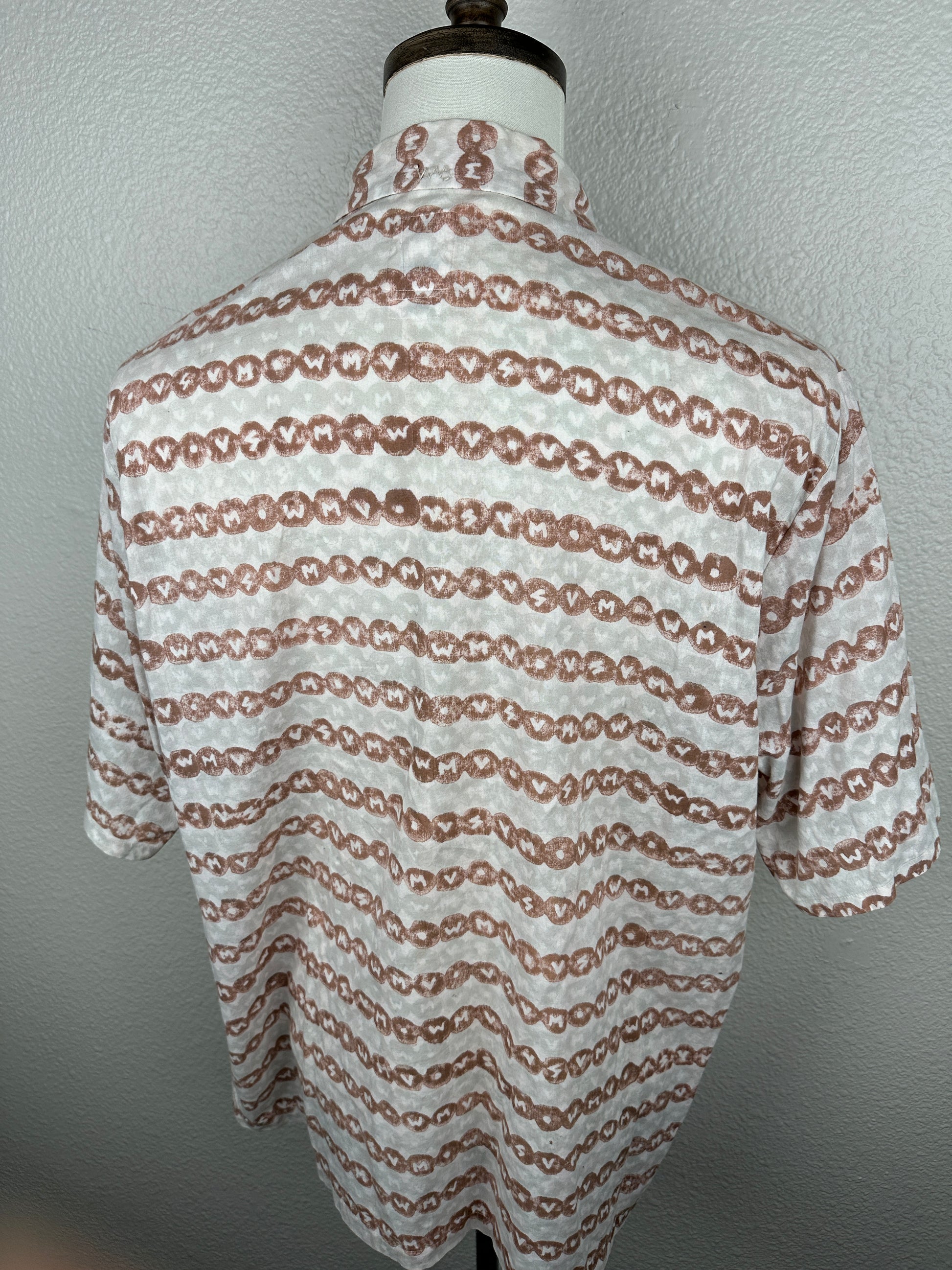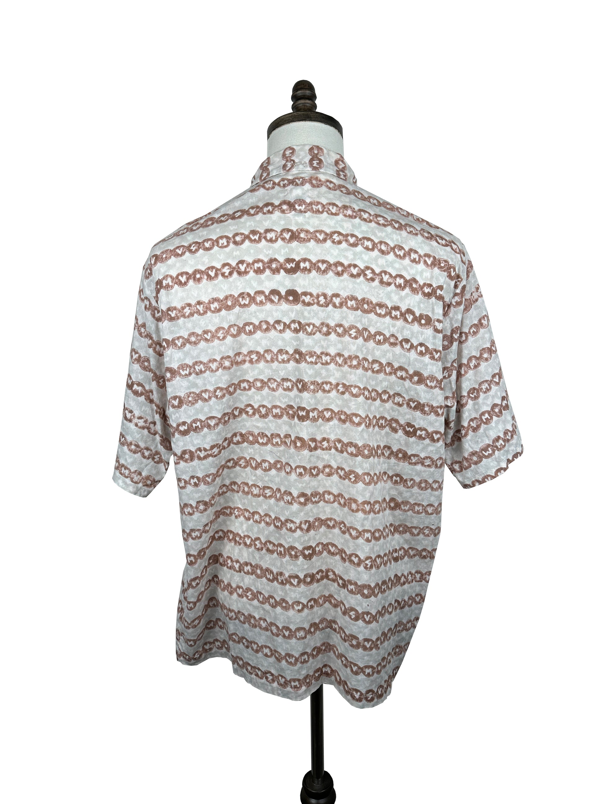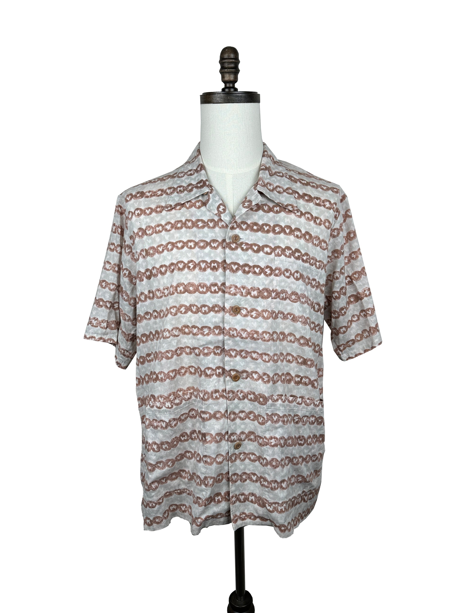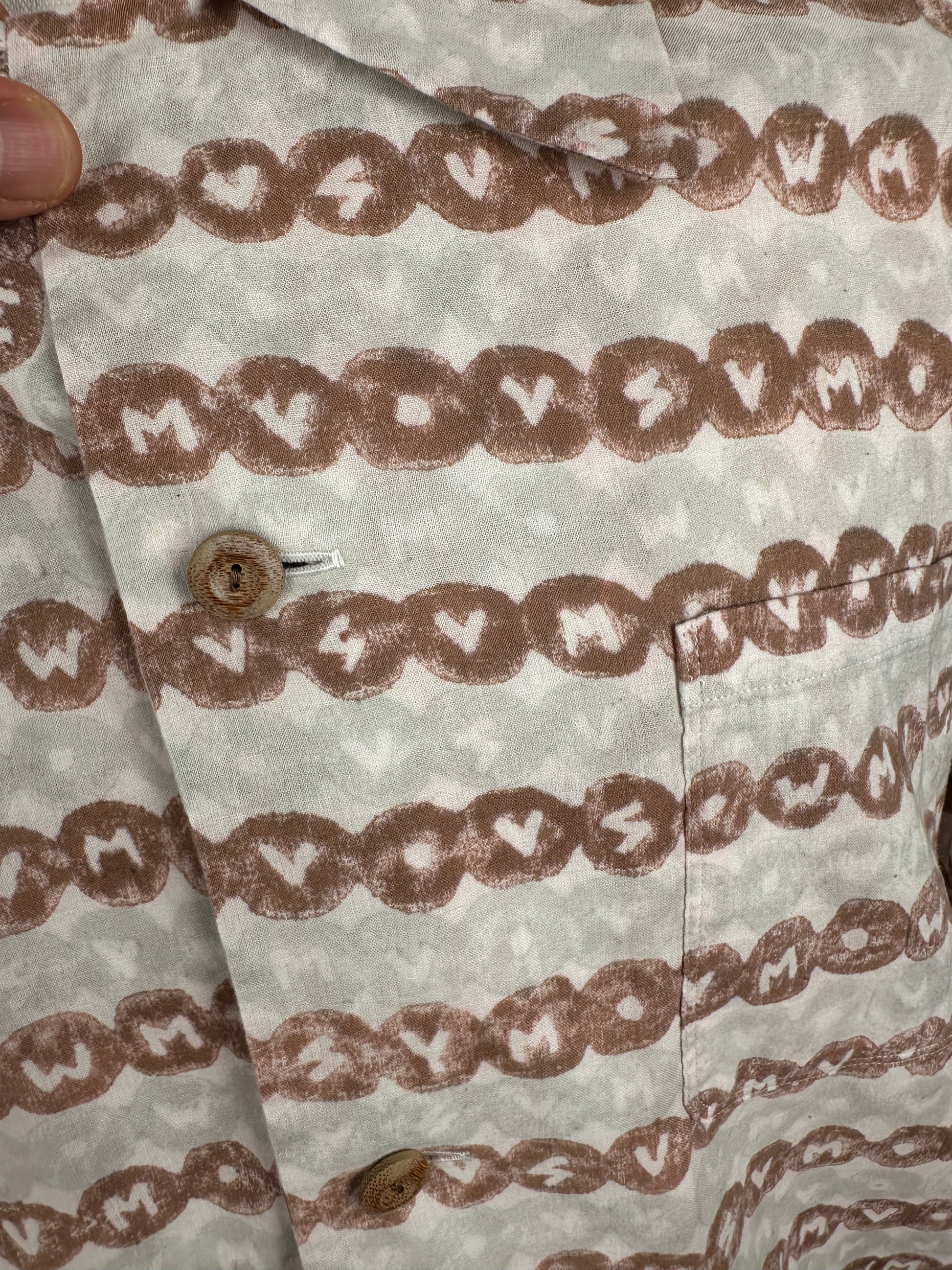 The shirt is constructed using a lightweight cotton fabric that features hand blocked stamp detailing throughout. The stamps are individually hand applied and feature alternating "VSVM" and "WMV" branding.