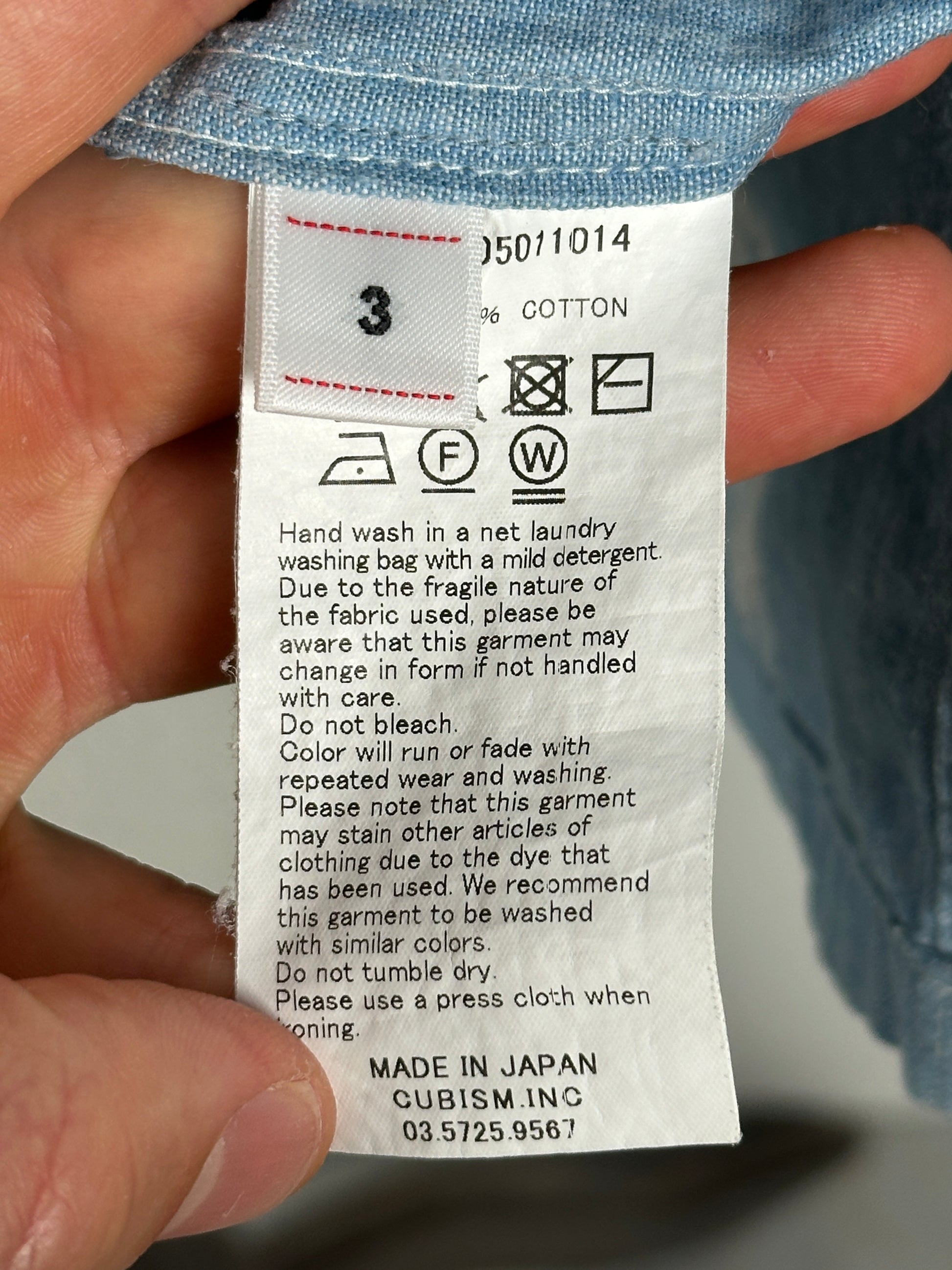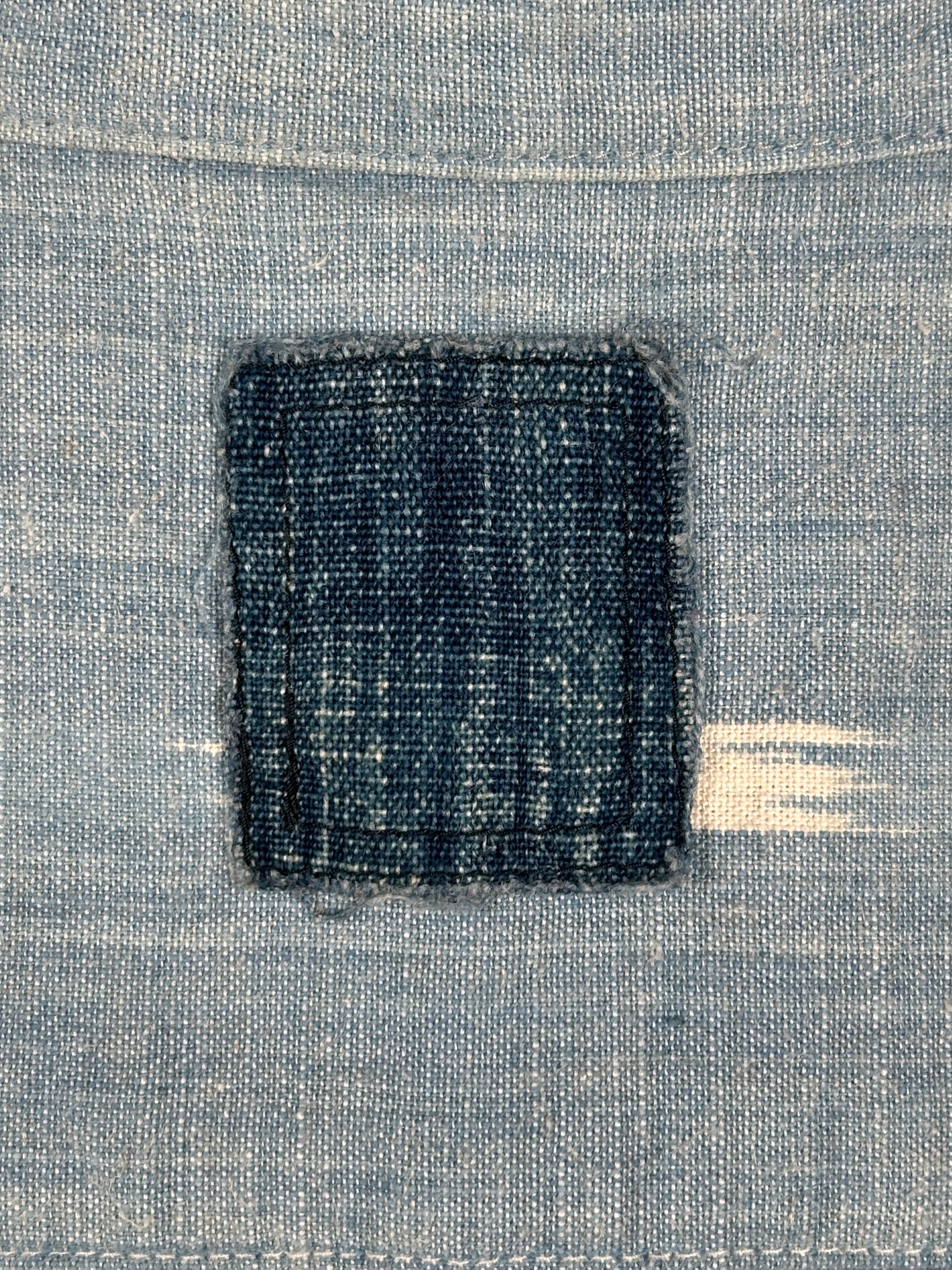 The shirt was constructed using a custom Japanese Kasuri fabric. Kasuri is a weaving technique that is characterized by its faint fragmented patterns: the threads are partially natural indigo-dyed beforehand and when woven together, the undyed segments of the thread appear as patterns on the fabric. The irregularities and the bleeding of the kasuri patterns creates an unevenness to the fabric that is very organic in character.