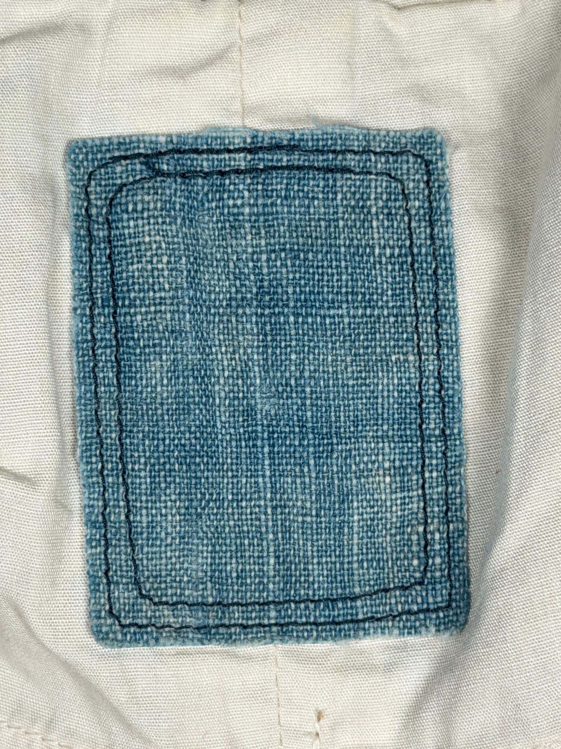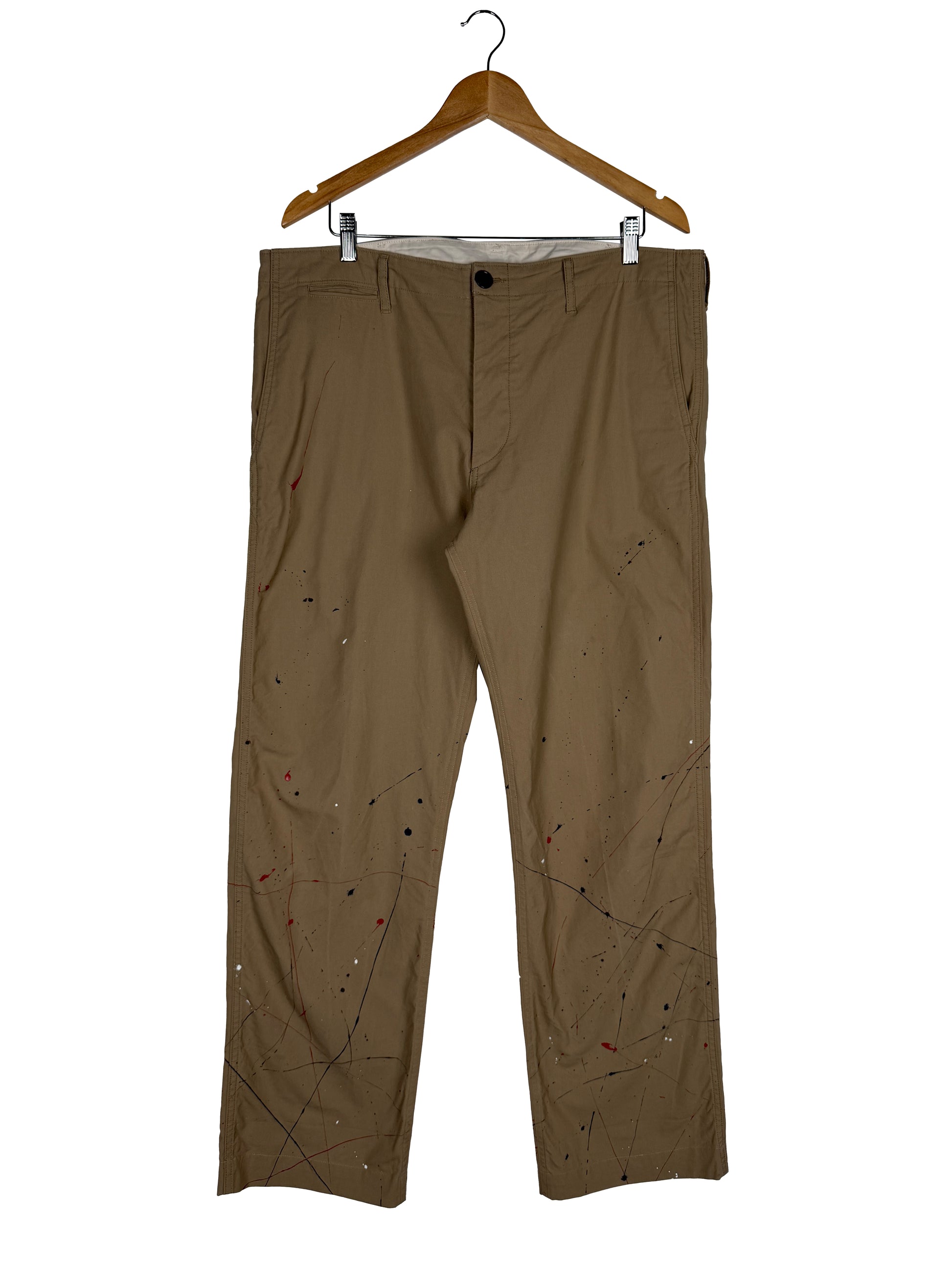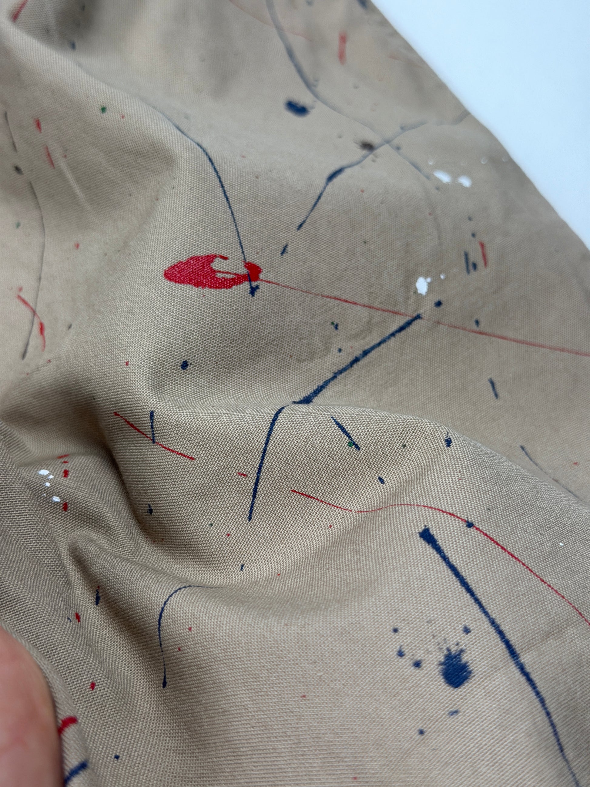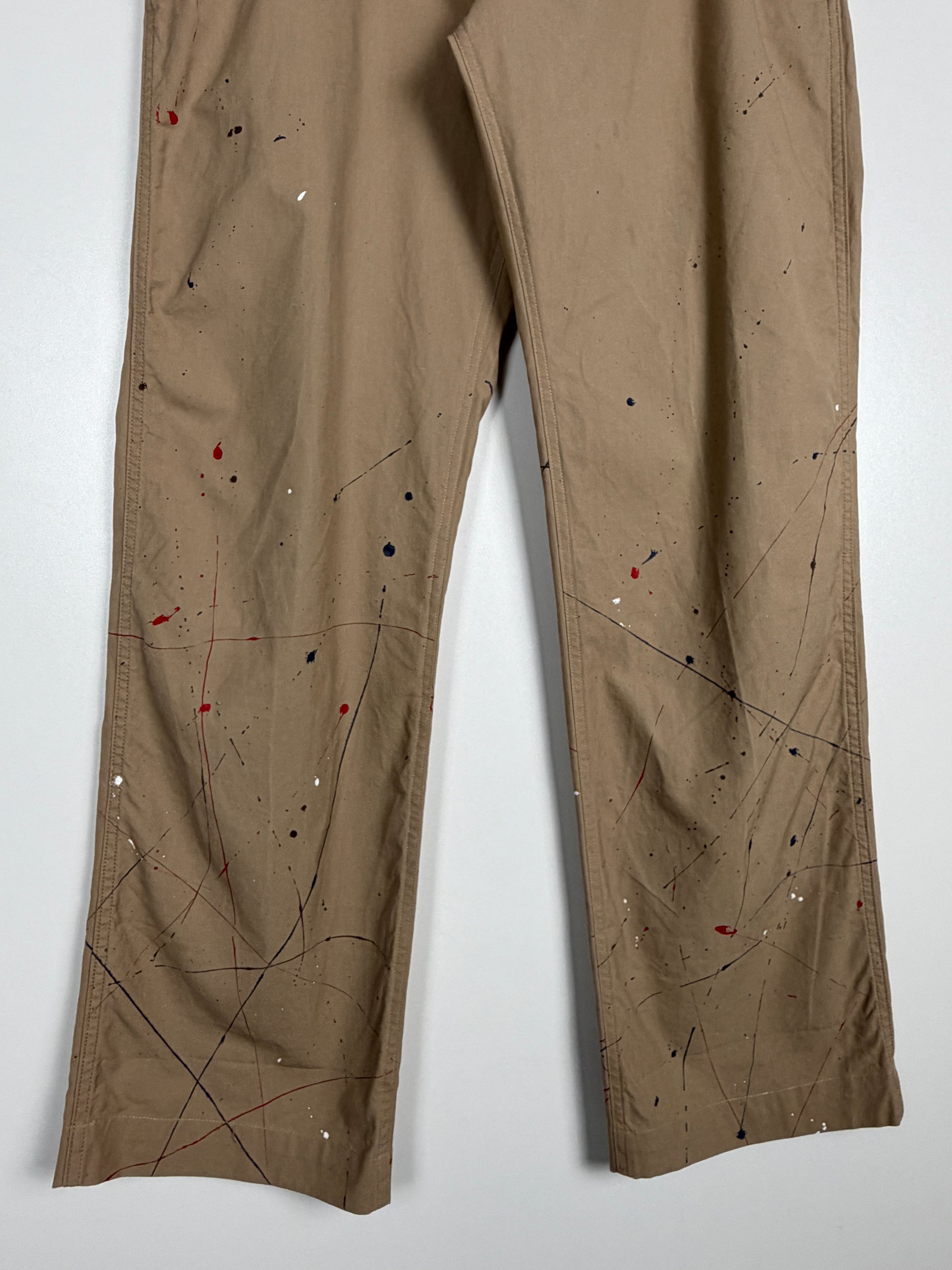 The pants are constructed using a lightweight twill fabric made from specially processed long staple cotton fibers. Once constructed, the pants were finished using a hand-drip paint detail.