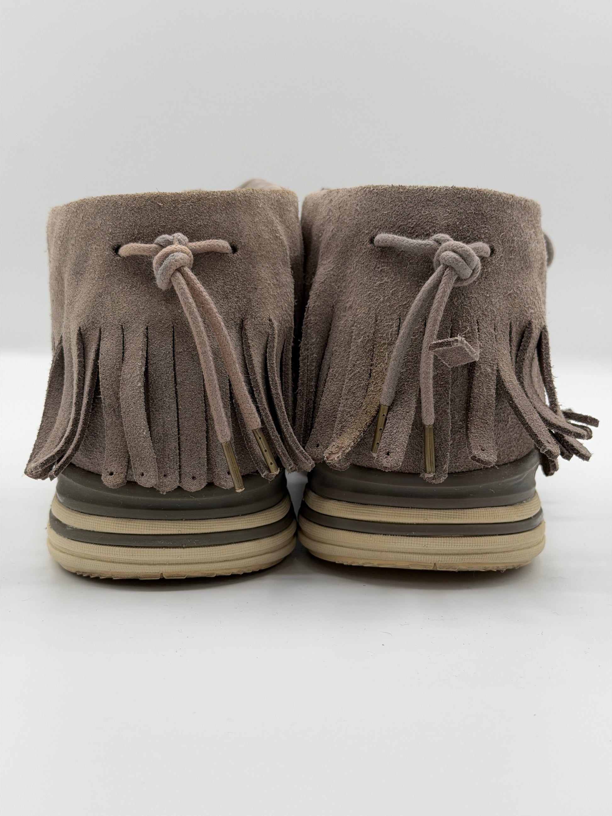 From Visvim's Spring/Summer 2021 Collection comes the FBT Shaman-Folk in Grey. The FBT was one of Visvim's first footwear silhouettes released during their second season in 2001. The inspiration came from a Fun Boy Three record cover, where lead singer Terry Hall was wearing moccasins. Hiroki decided to combine the traditional moccasin with an EVA Phylon midsole used for trainers to blend the elements of Native American and streetwear culture.