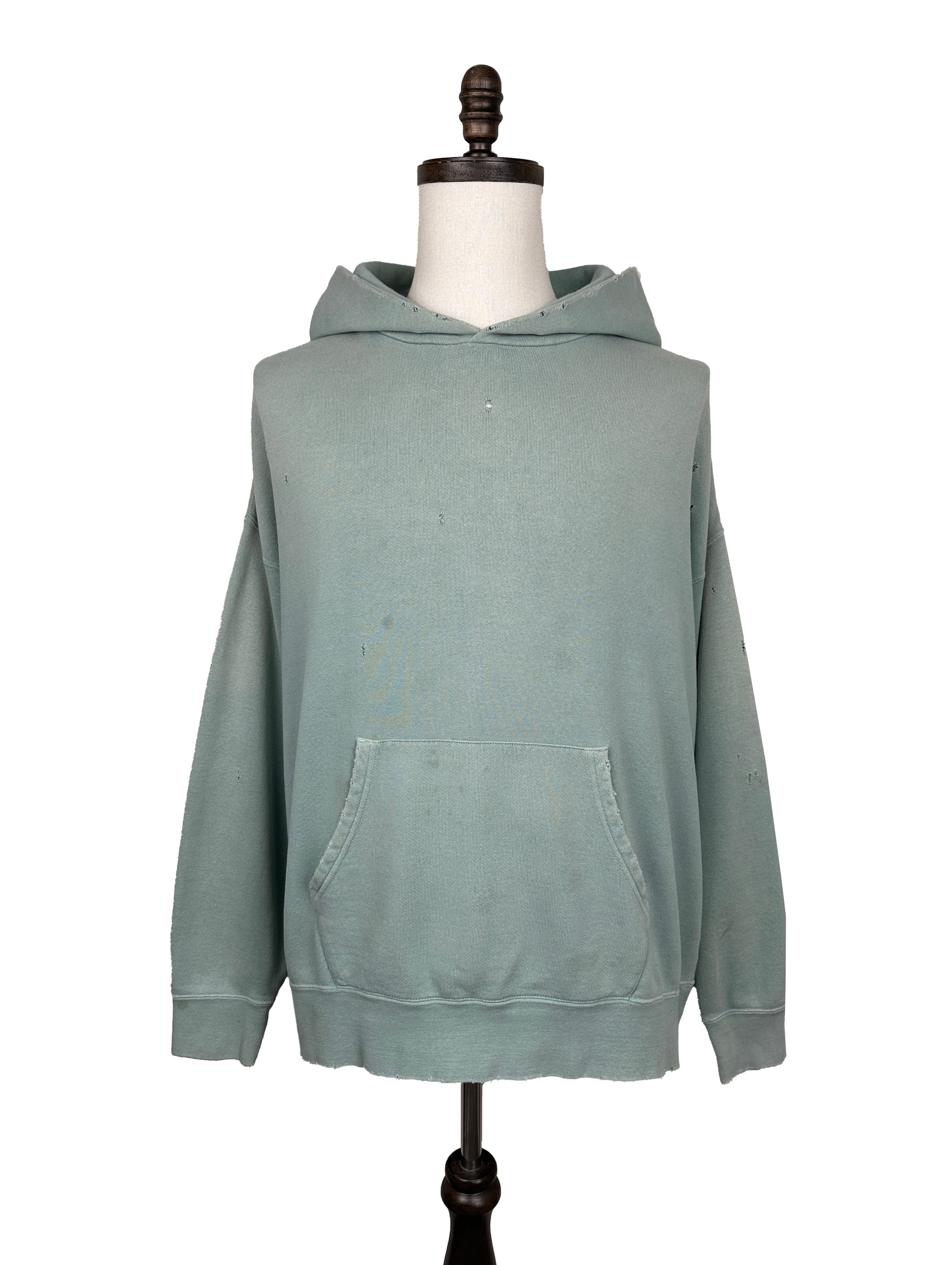 The hoodie is constructed using a French terry cotton. Once constructed, the hoodie was crash processed for a weathered appearance.