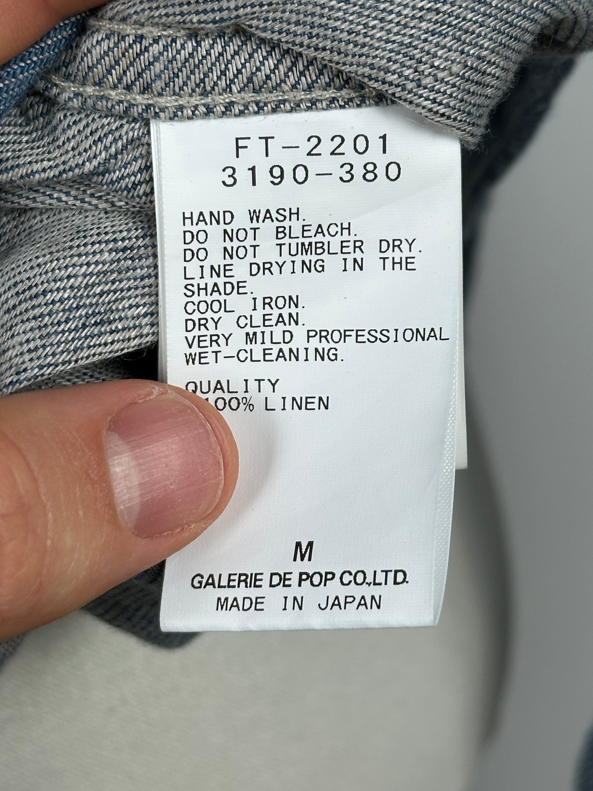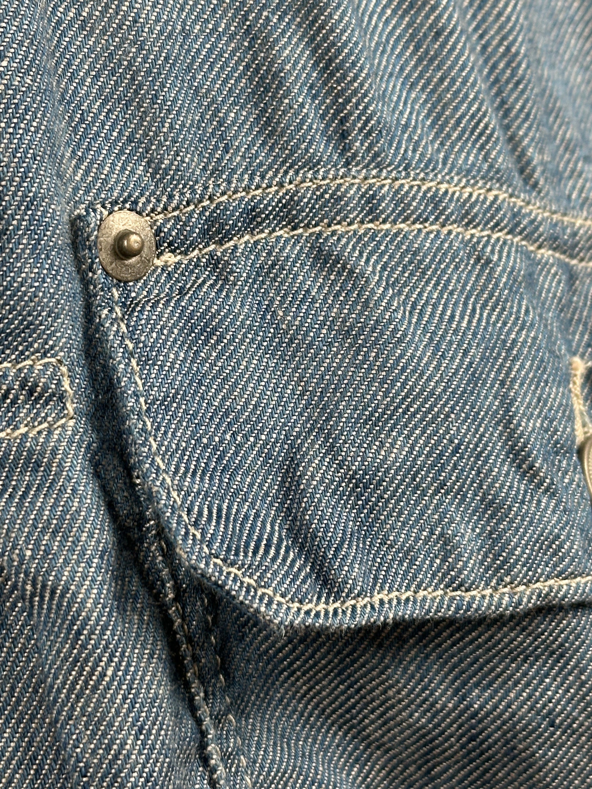 The jacket was constructed using a custom 6.5 oz denim fabric made completely out of linen yarns resulting in an incredible luster, firmness and unique texture. The warp yarns are dyed in indigo, while the weft yarns are left undyed creating a vintage-like finish.