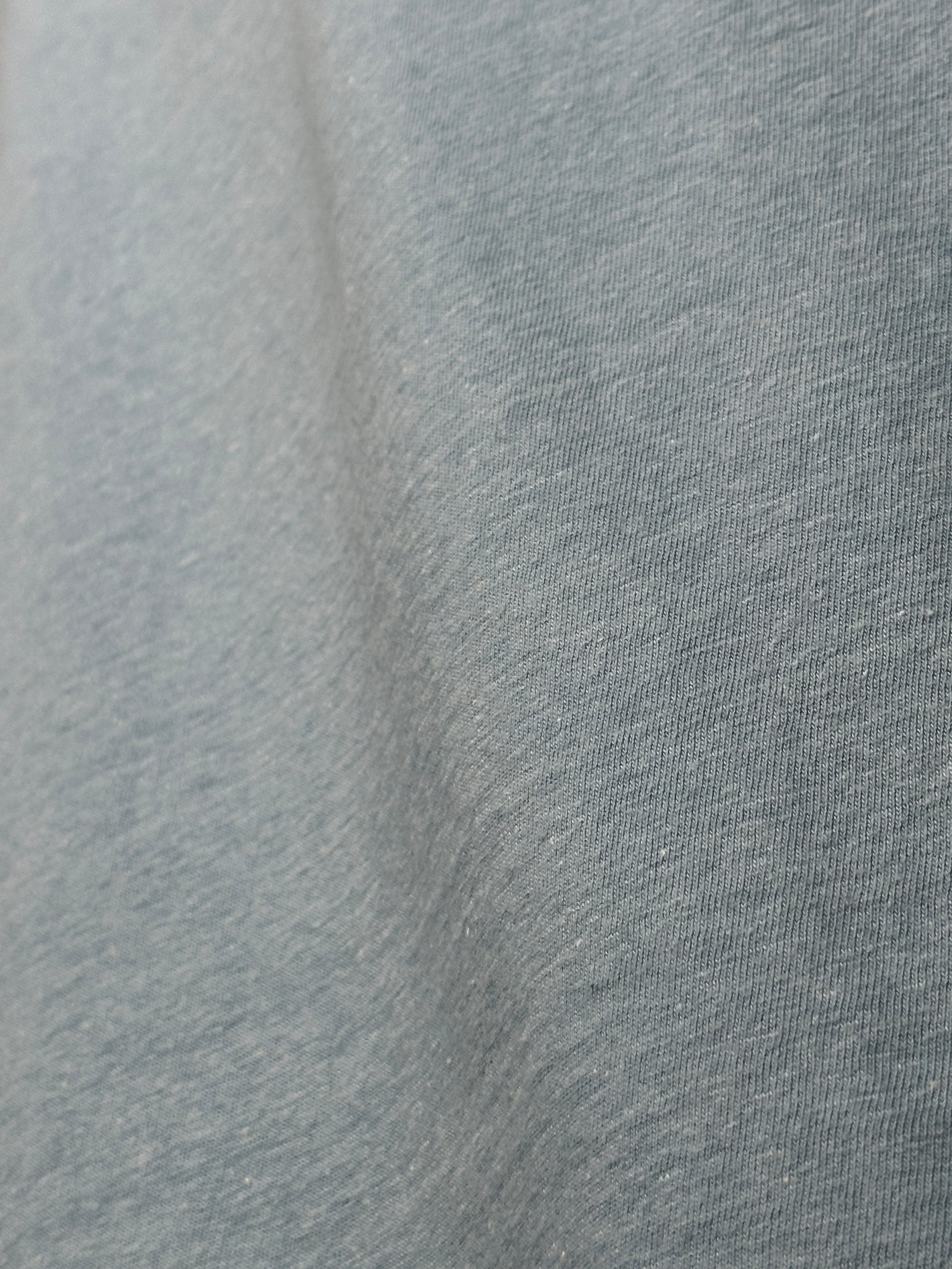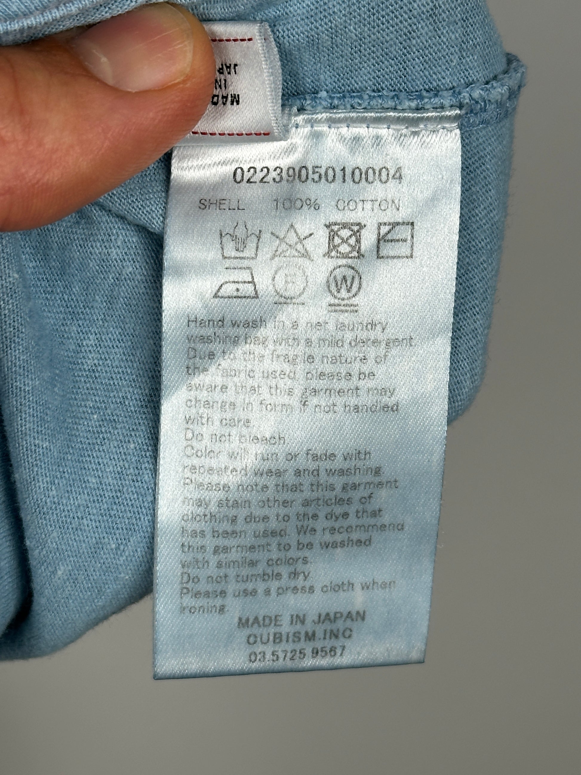 The tee is constructed using a cotton jersey fabric. Once constructed, the tee was indigo overdyed.