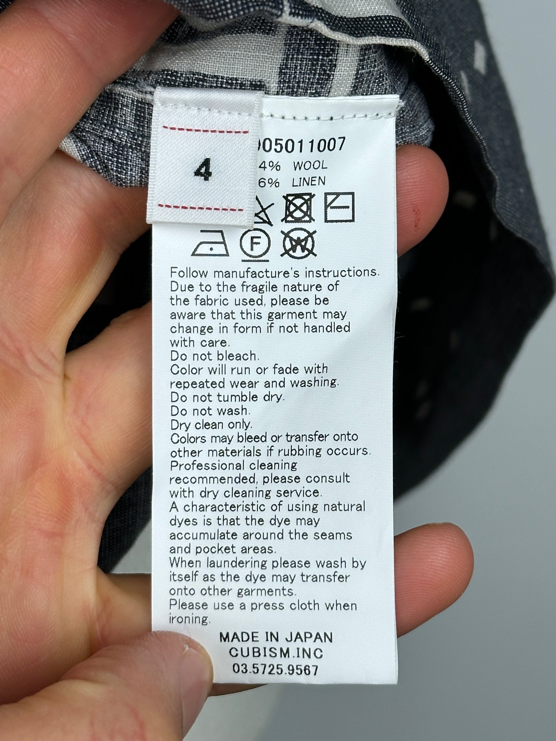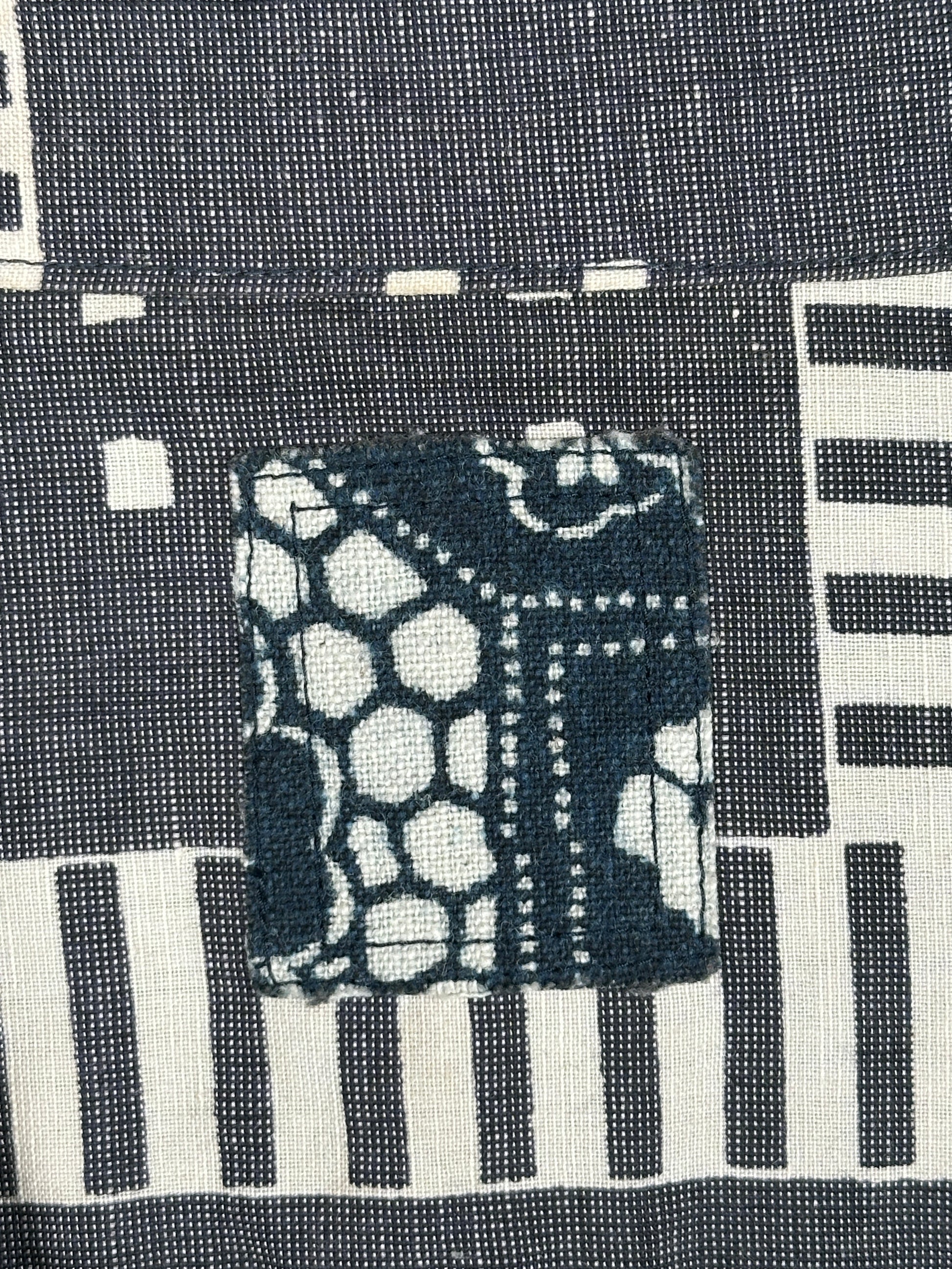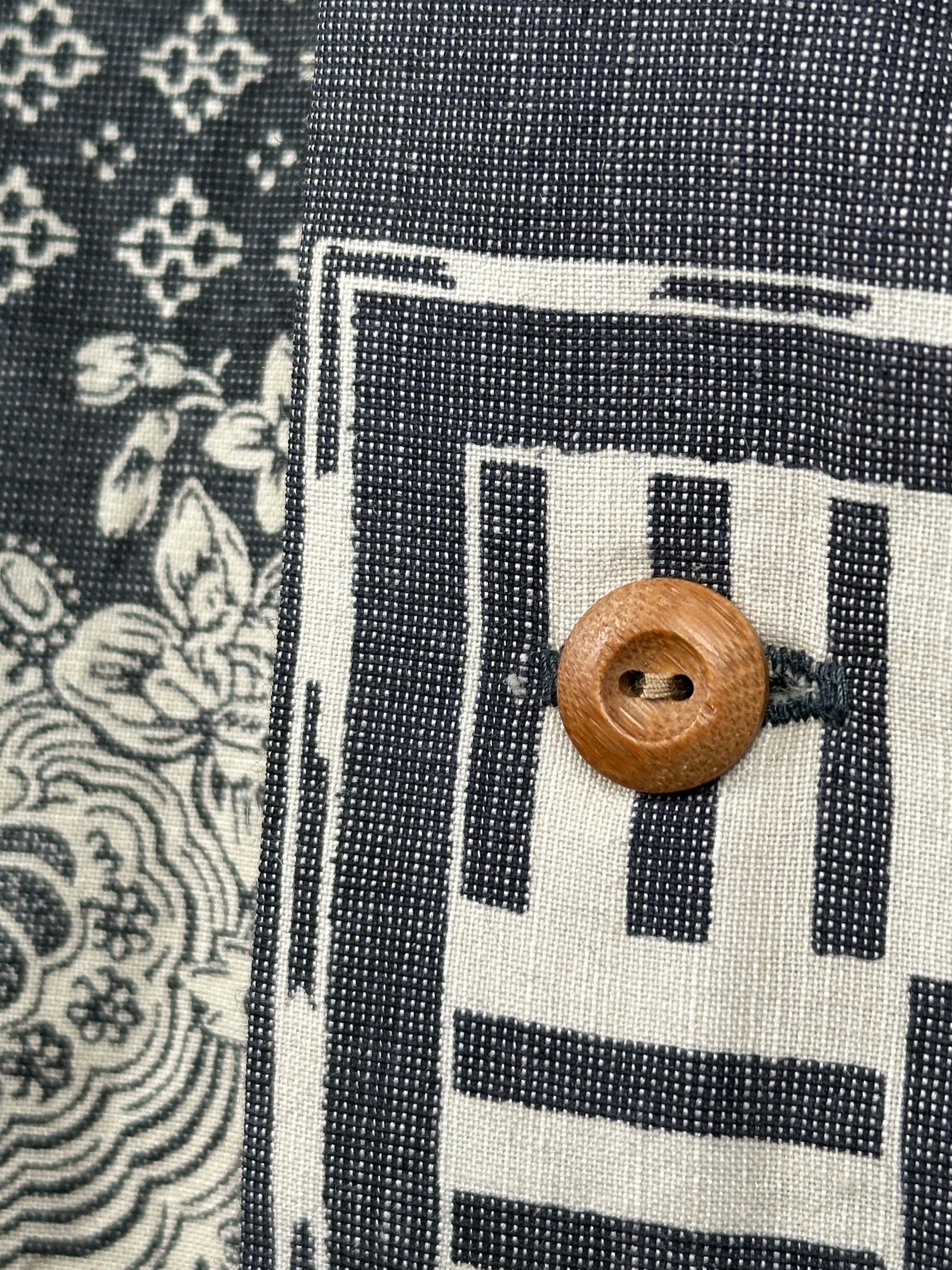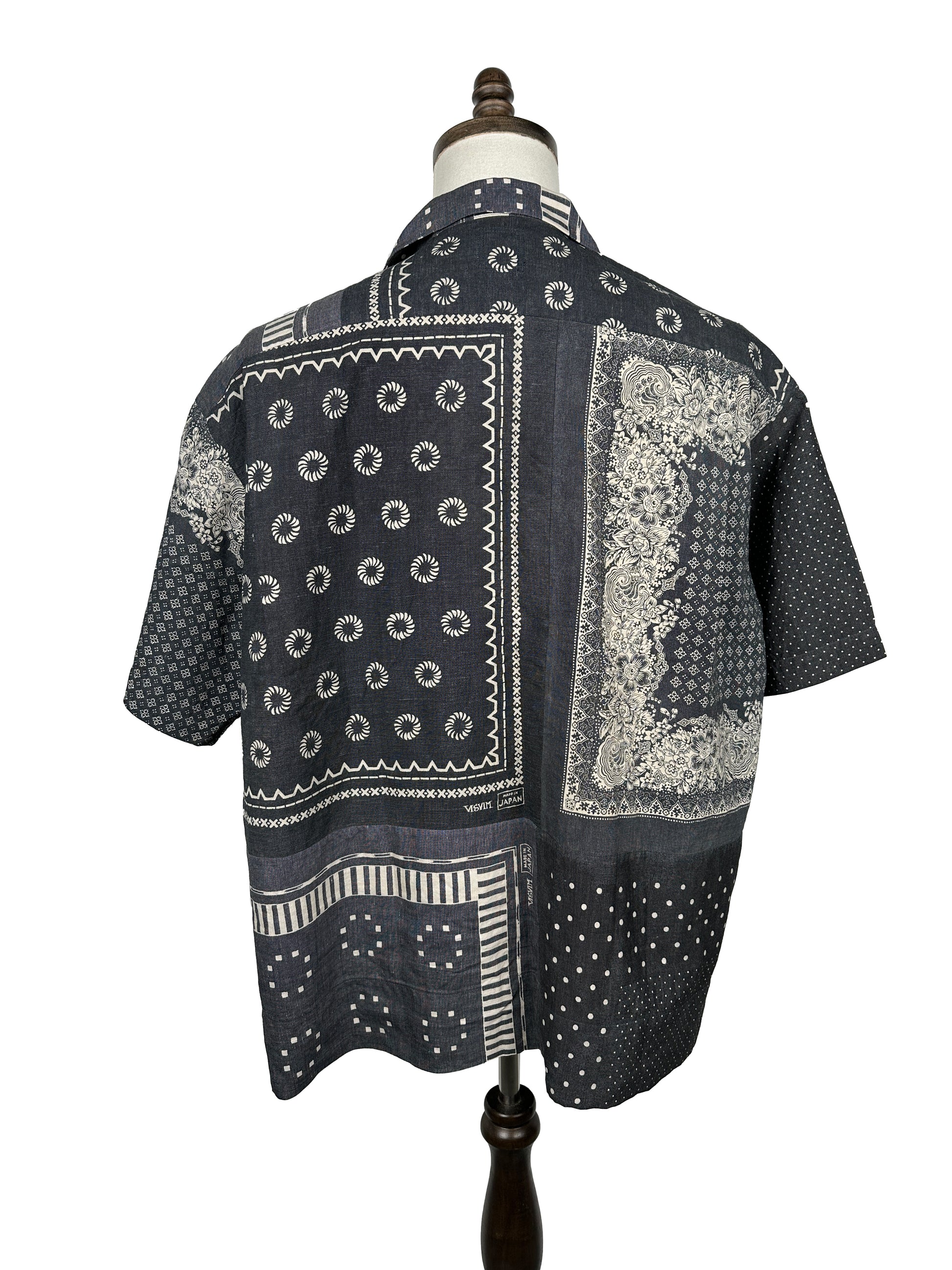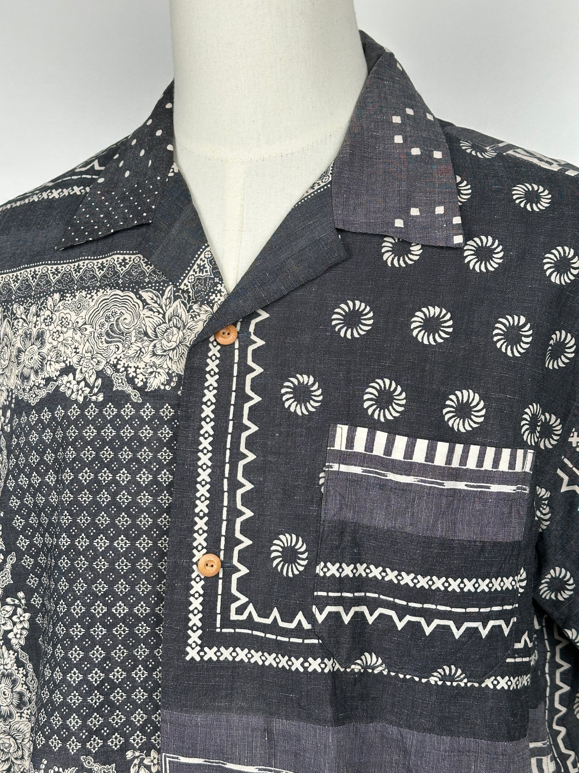 The shirt was constructed using an original lightweight wool/linen blend bandana fabric woven in a patchwork design; the fabric is characterized by a structured shape with a dry hand. Once constructed, the shirt was mud overdyed at Amami Ōshima, Japan for a truly unique appearance and texture.