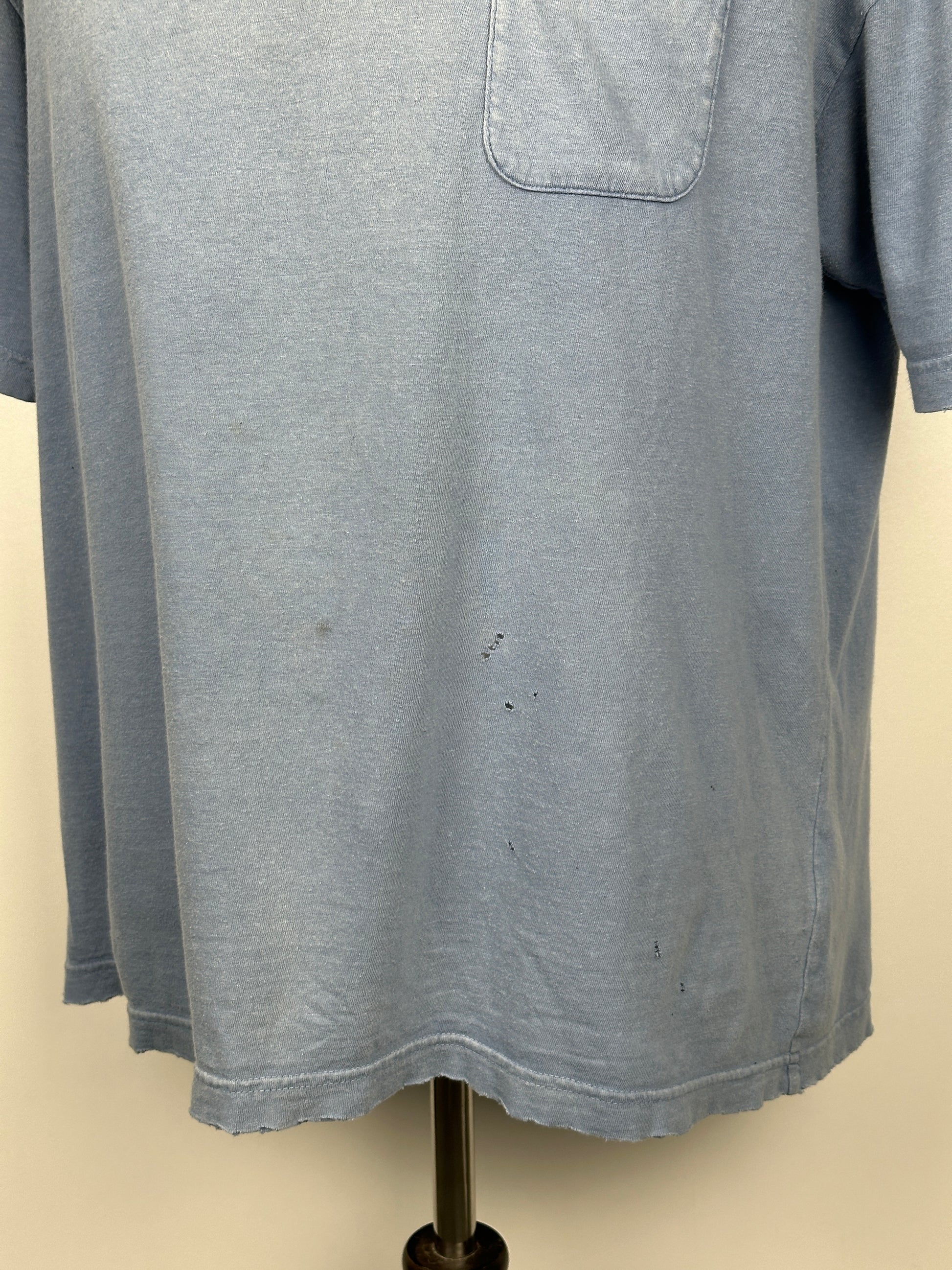 The tee was constructed using a textured jersey fabric made from dry processed cotton fibers. Once constructed, the tee was garment dyed and crash processed for a weathered appearance.