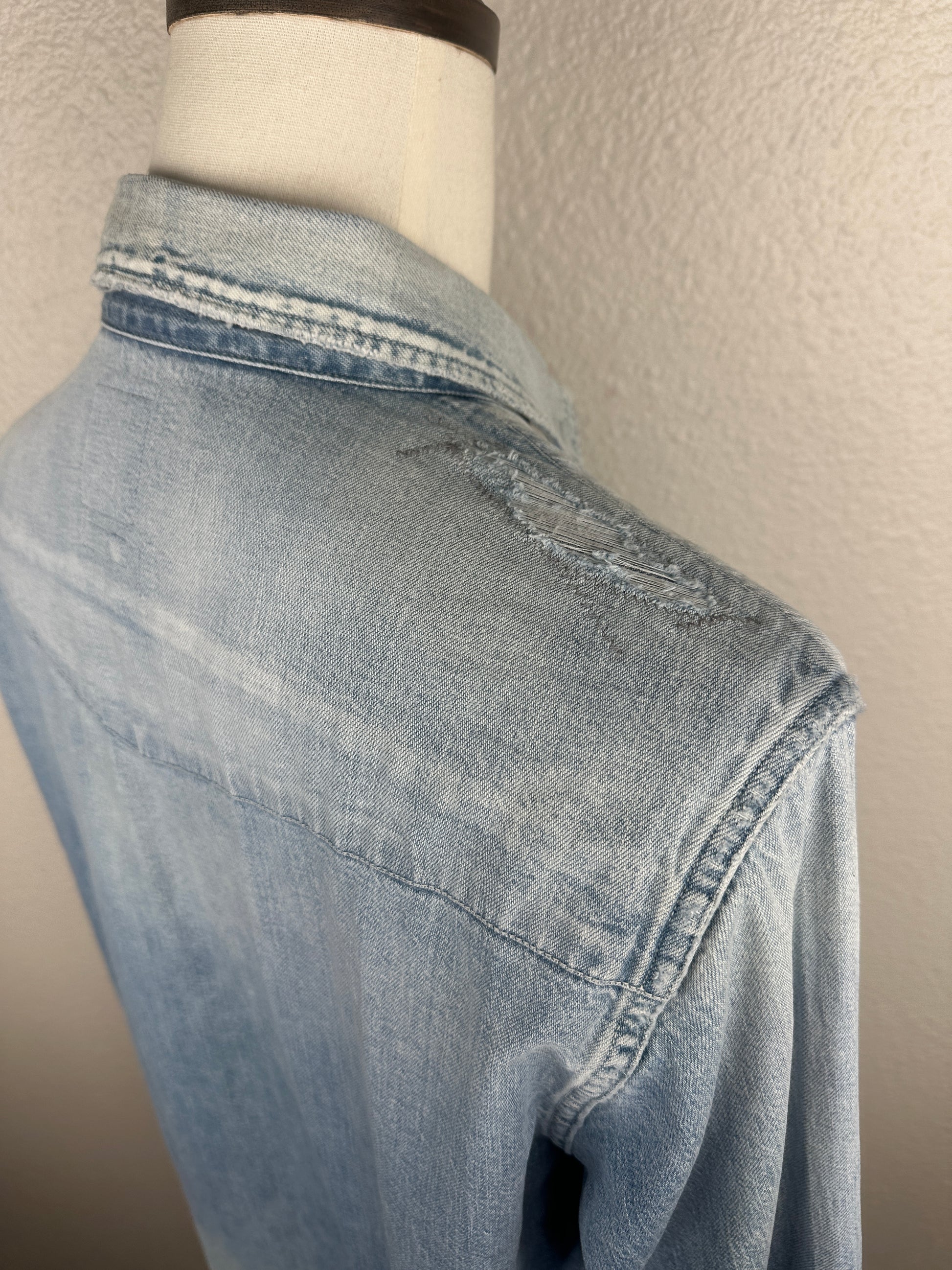 Additional details include grey selvedge piping throughout, and American mother of pearl snap buttons.