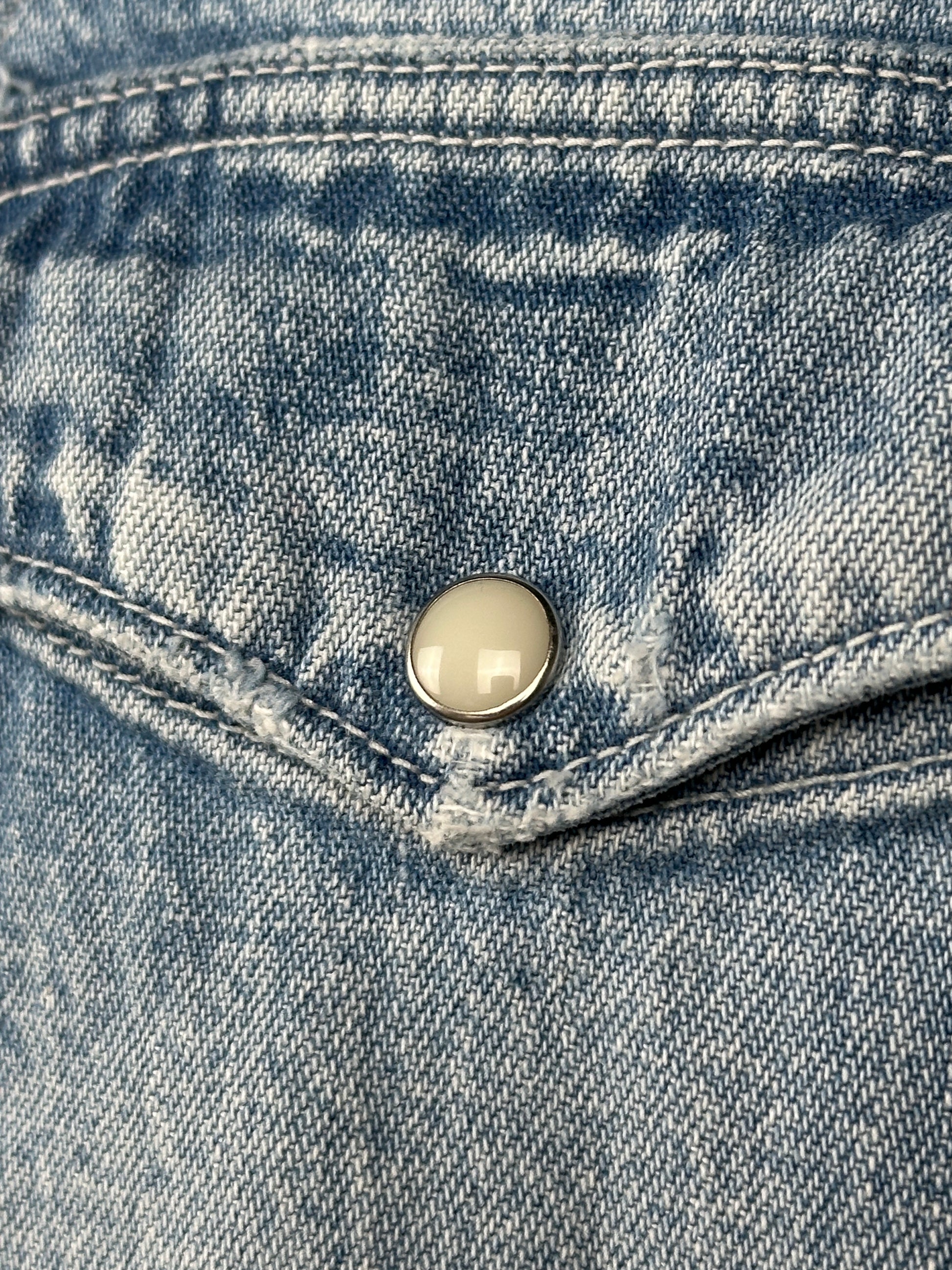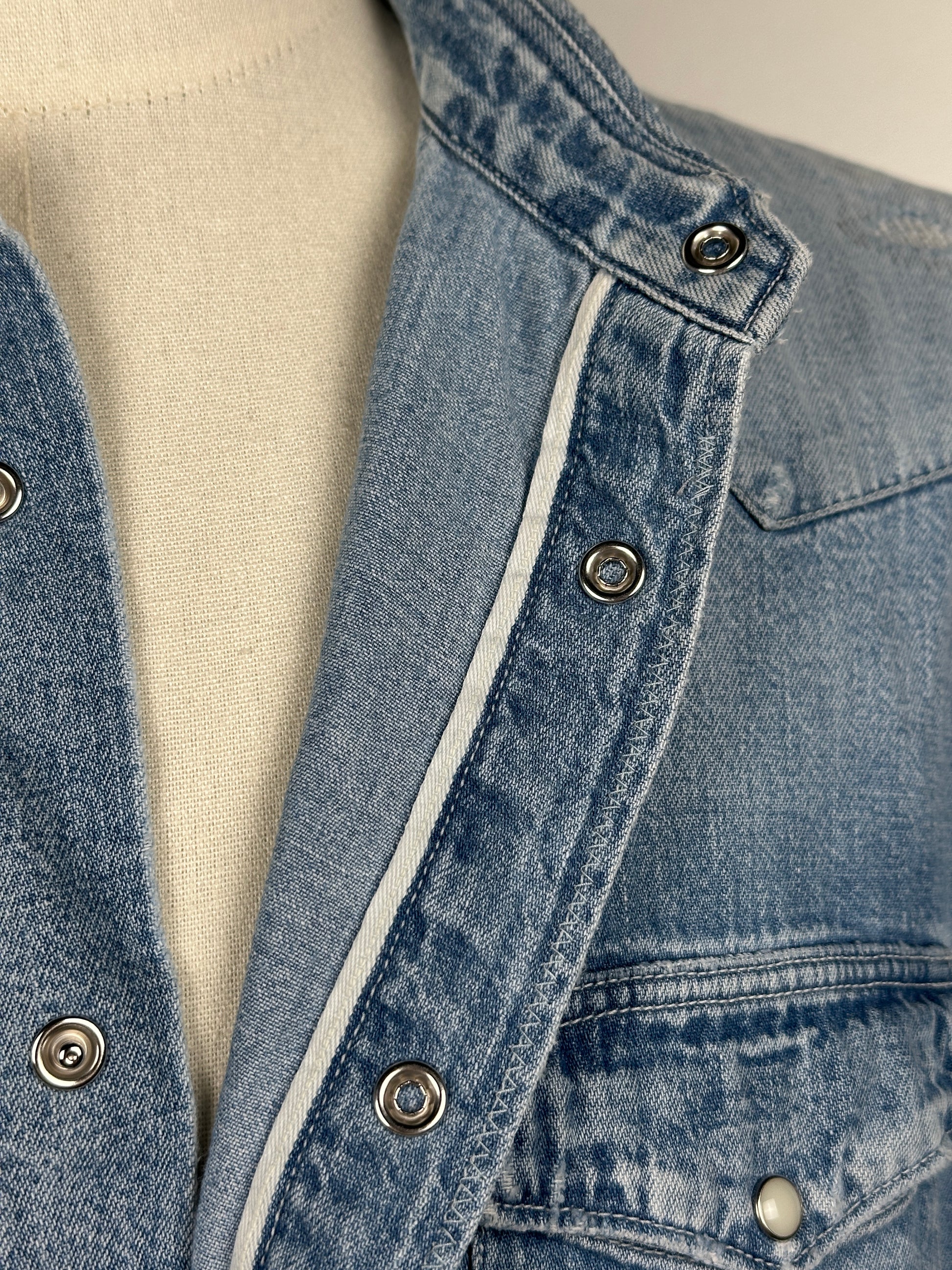 Additional details include grey selvedge piping throughout, and American mother of pearl snap buttons.
