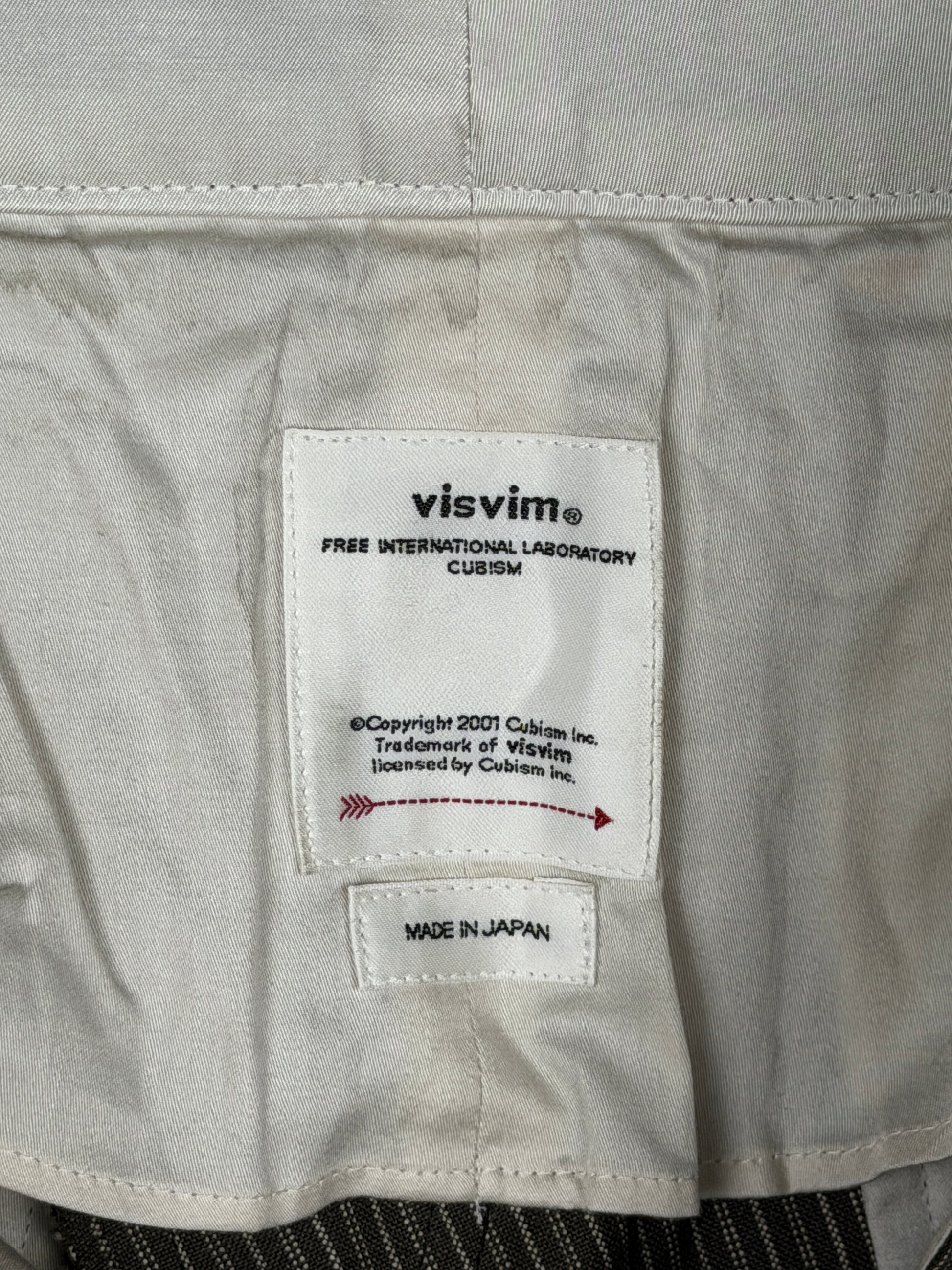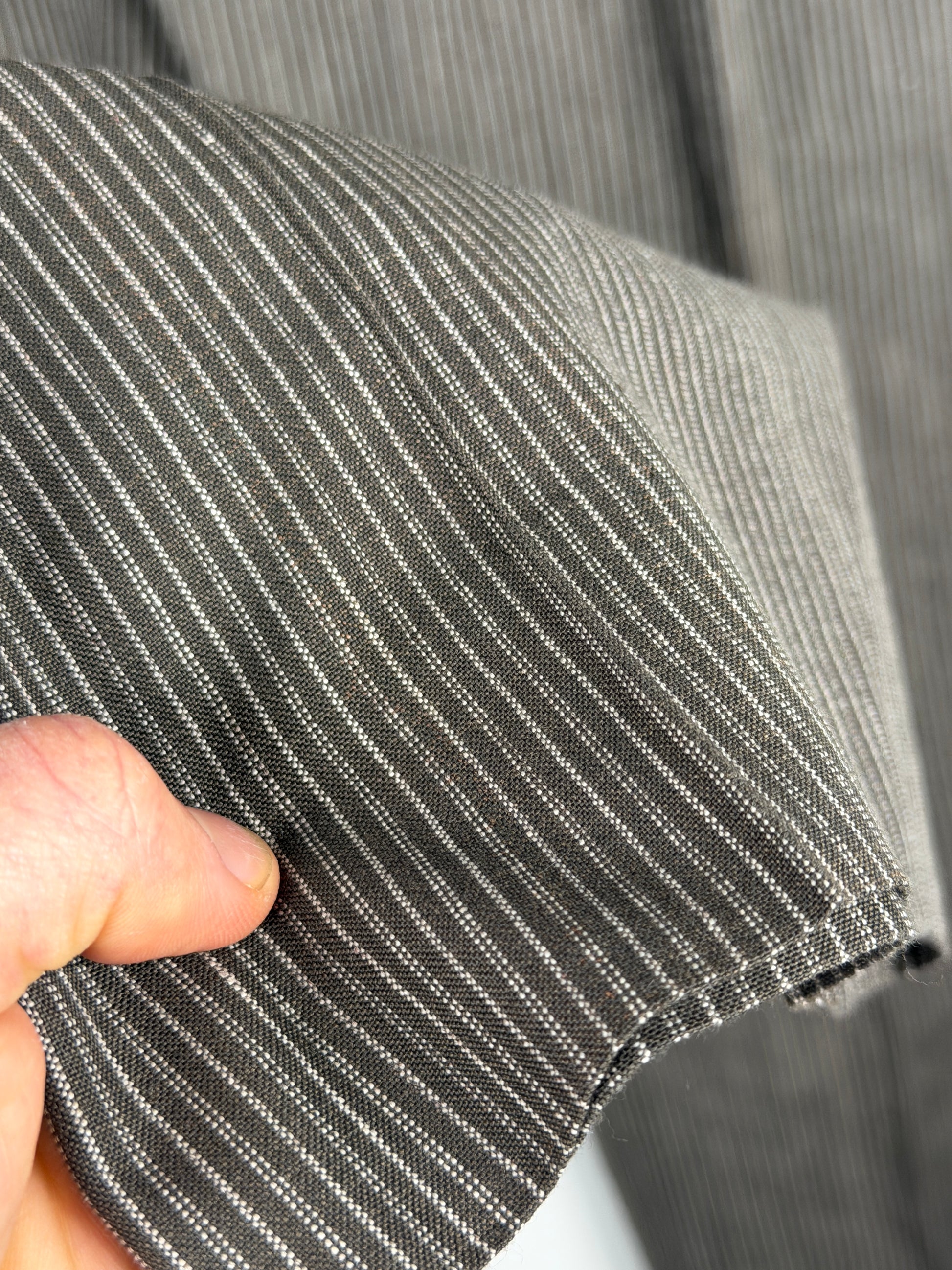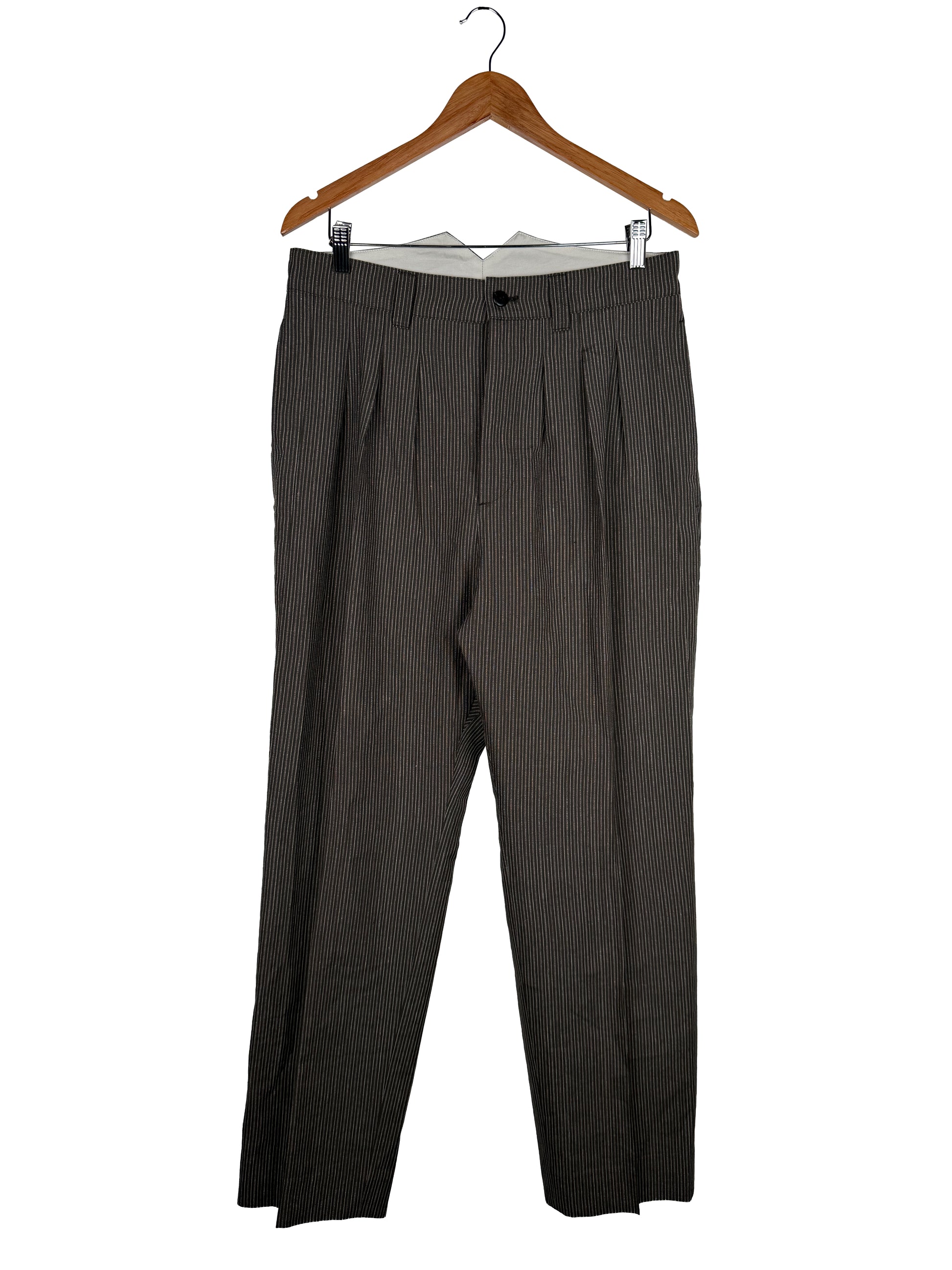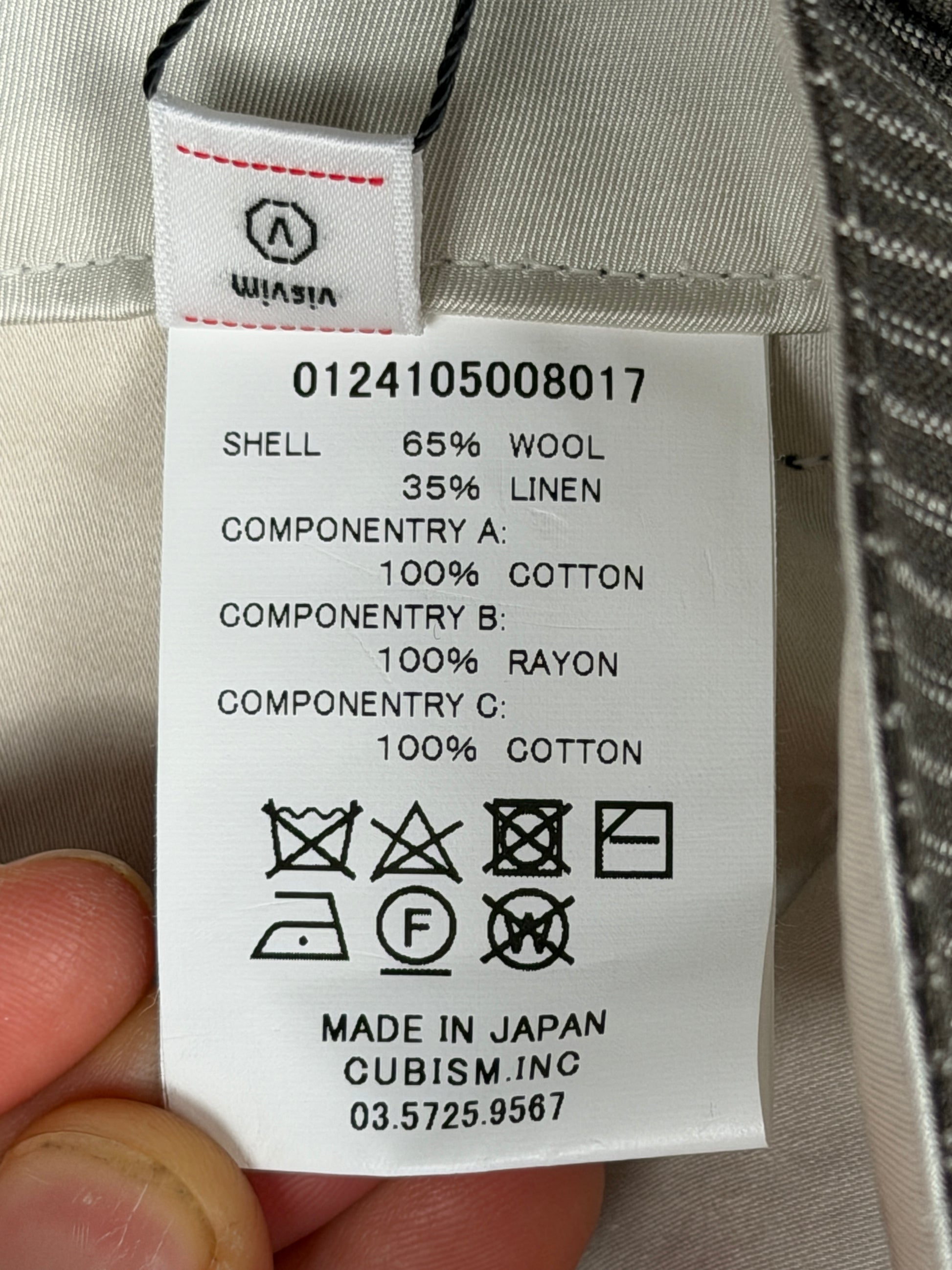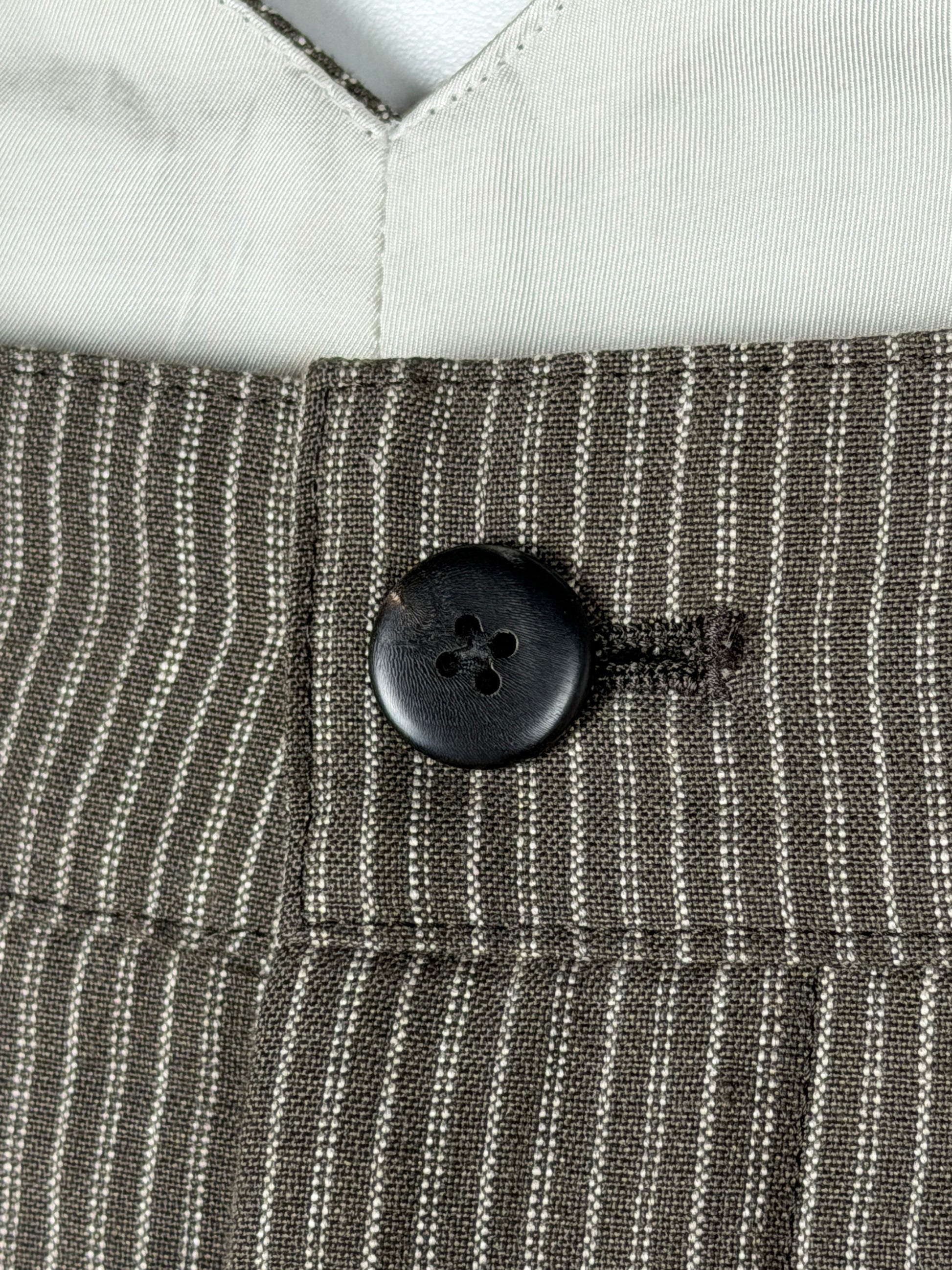 The pants were constructed using an original wool/linen blend Santome fabric. Deriving its name from its place of origin in Southeast India, Santome fabric is created by blending different textiles with varied widths in a complex weave which brings out the natural character of the fibers.