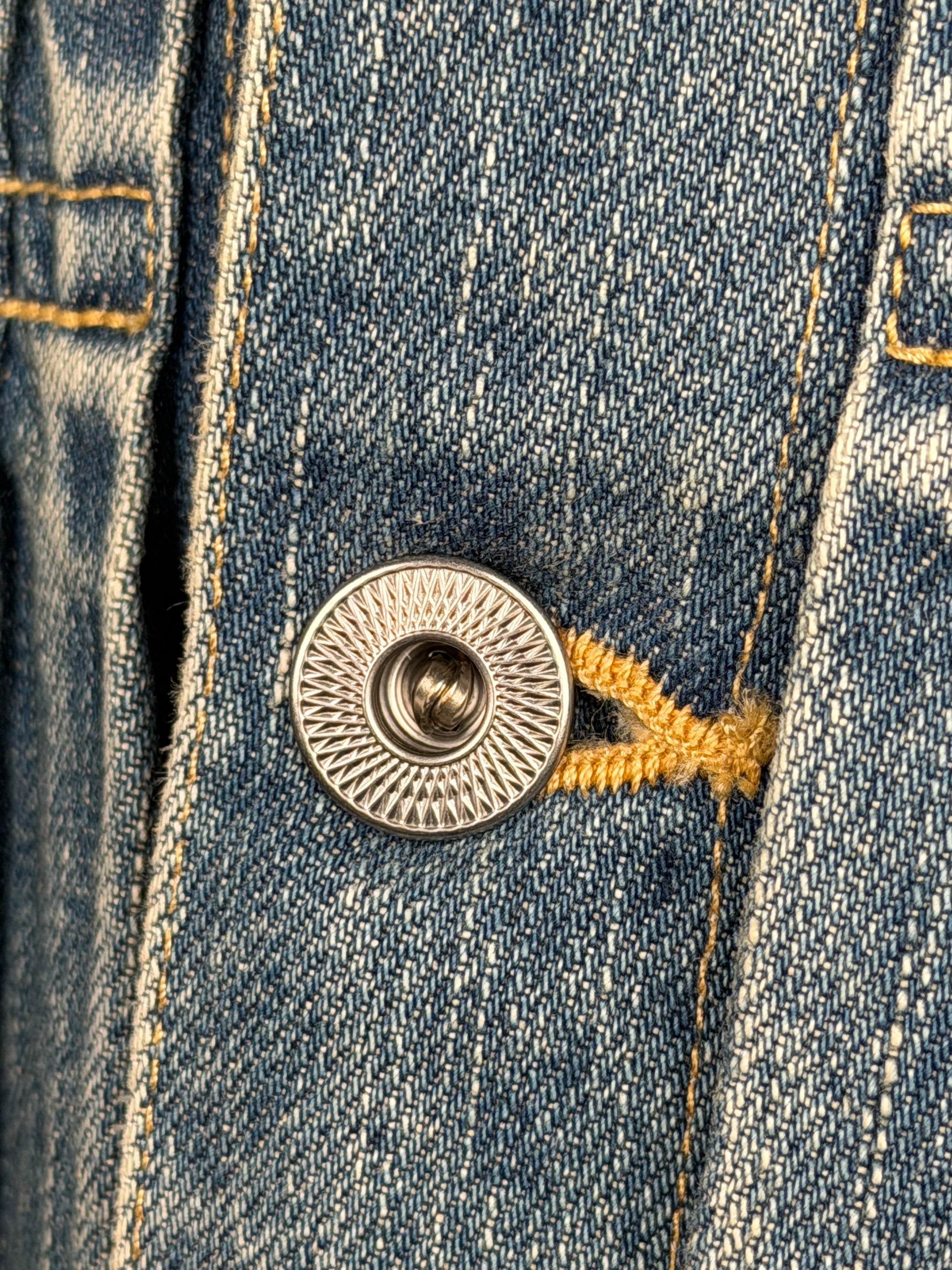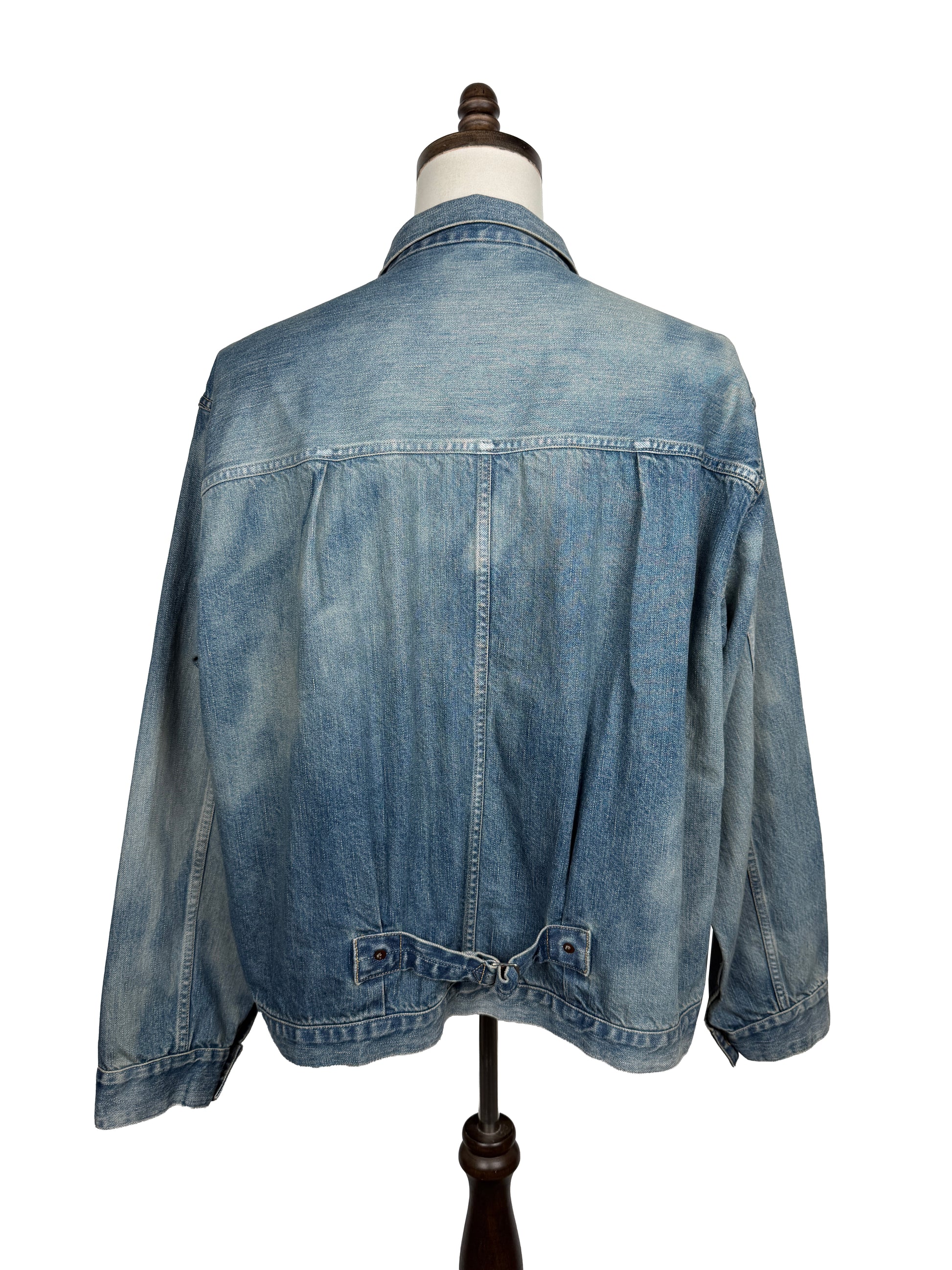 The jacket is constructed using a custom woven high-density 13oz red-selvedge indigo denim, recreating the threading used in the 501xx from the late '50s to early '60s. The vertical fading creates a beautiful, vintage feel. Once constructed, the jacket was hand processed for an uneven color to recreate a vintage aging effect.