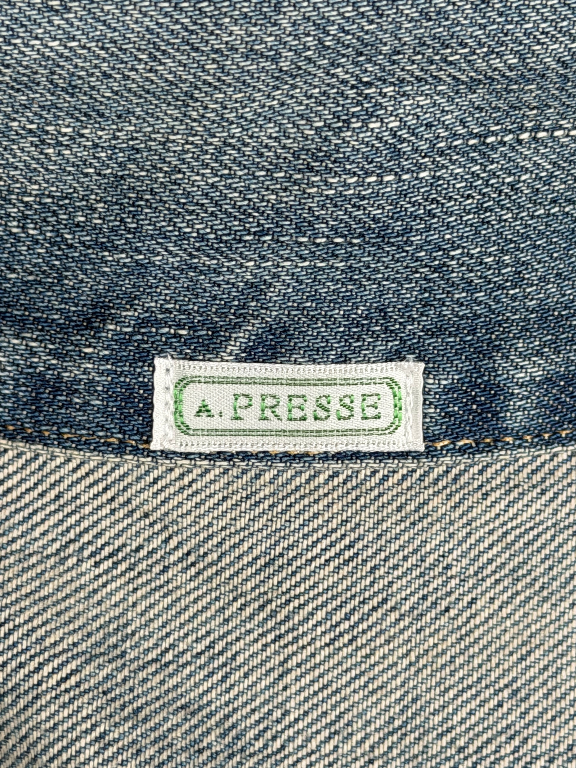 From A.Presse's Spring/Summer 2025 Collection comes the 1st Type Denim Jacket in Indigo. The 1st Type Jacket is a 4-button jacket modeled after a WW2-era 506XXE, known as the "T-back" style featuring a boxy cut with a drop shoulder, one patch chest pocket with riveted reinforcement, and a cinch-back adjustment. The main discrepancy being the riveted pockets, which were not found on Type 1 jackets during WW2.