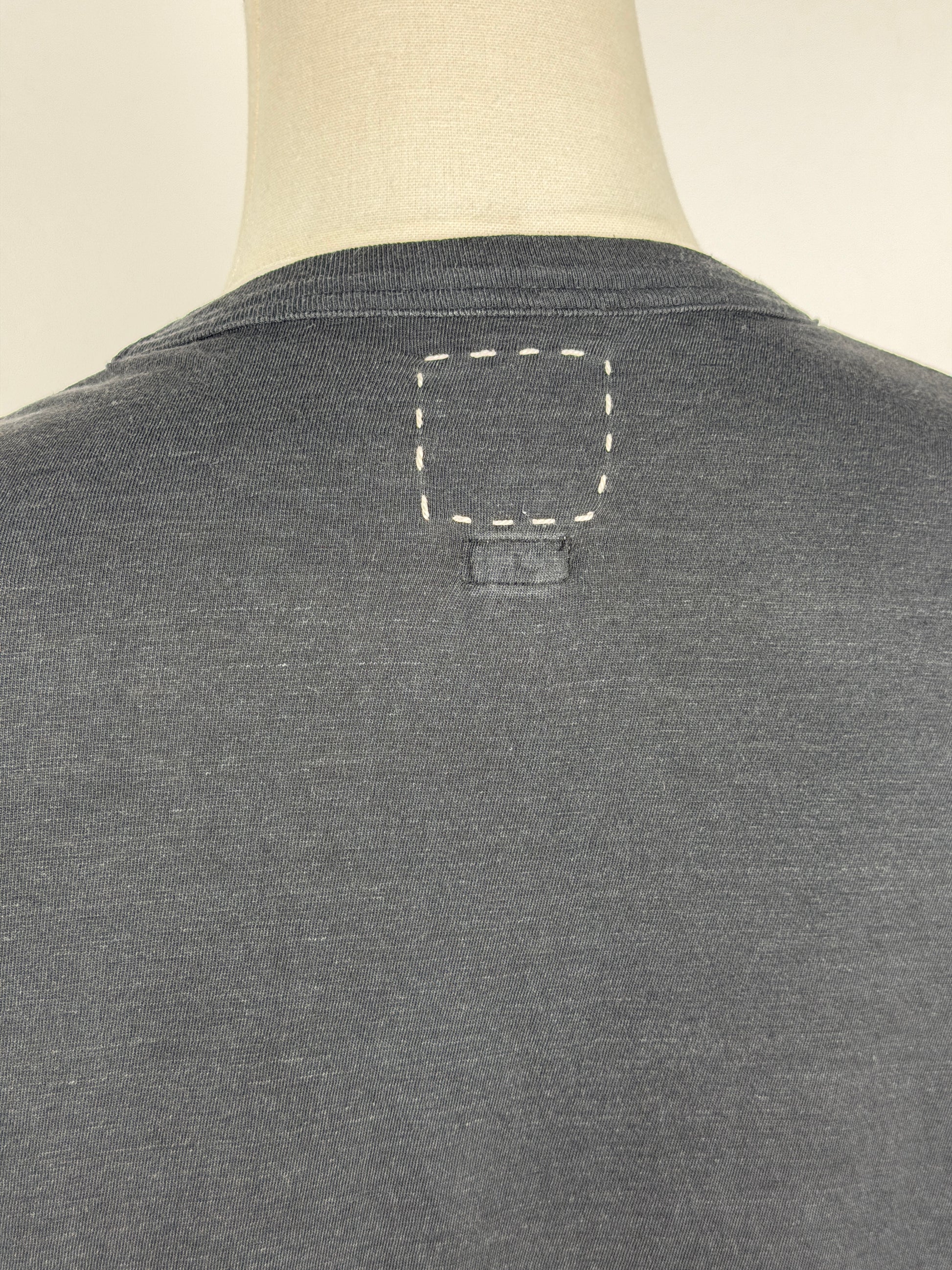 The tee is constructed using a custom cotton-nylon blend fabric. Once constructed, the tee was garment dyed and damage finished for a worn appearance.