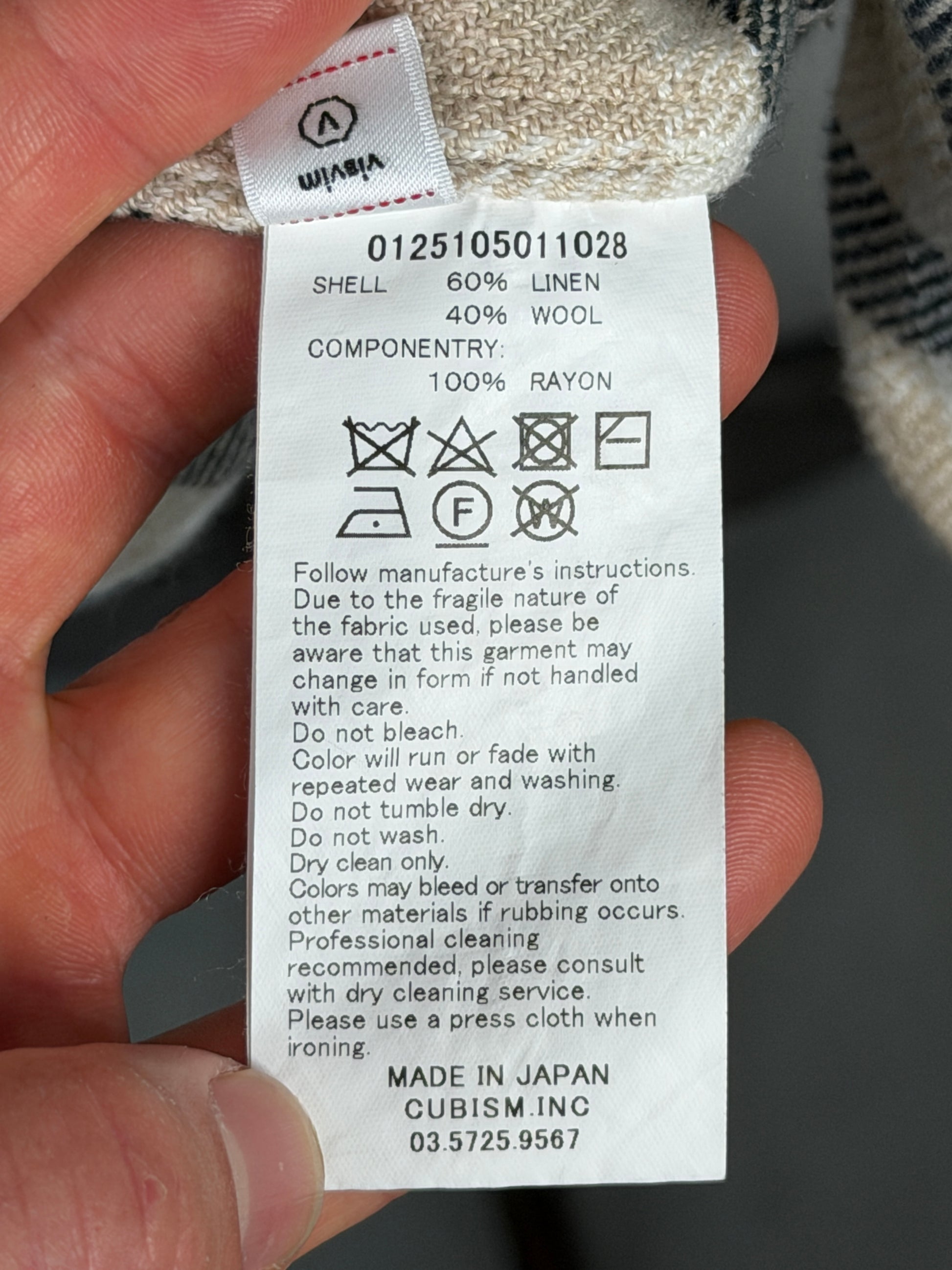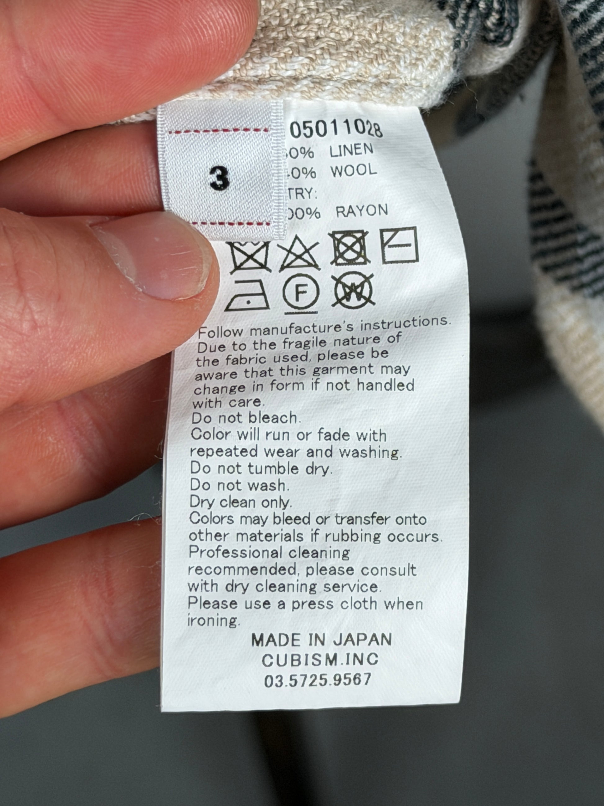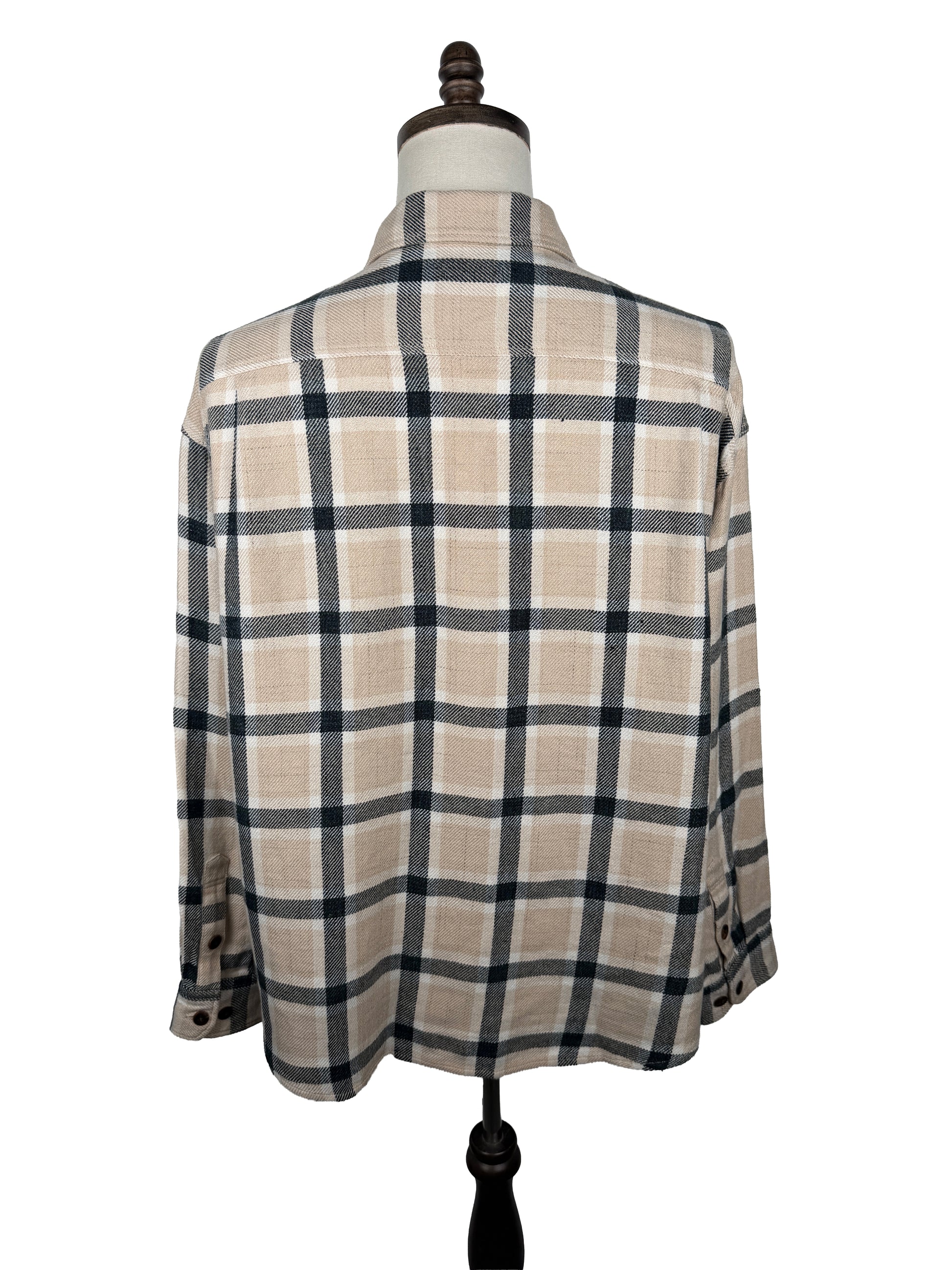 The shirt is constructed using a custom check twill fabric woven using linen and wool fibers. The shirt is partially lined in rayon fabric at the back yoke and cuffs. Once constructed, the shirt was one wash processed for a worn-in look and texture.