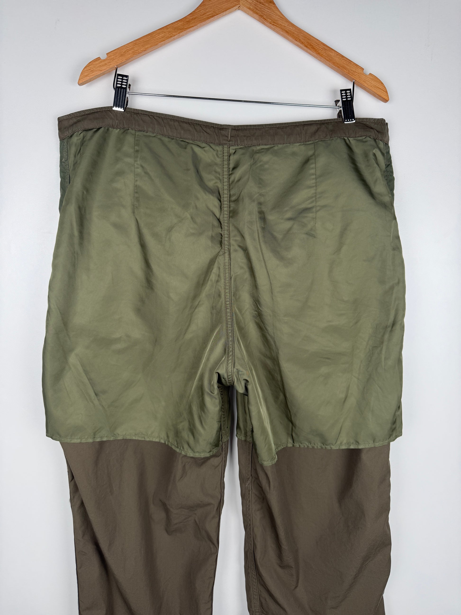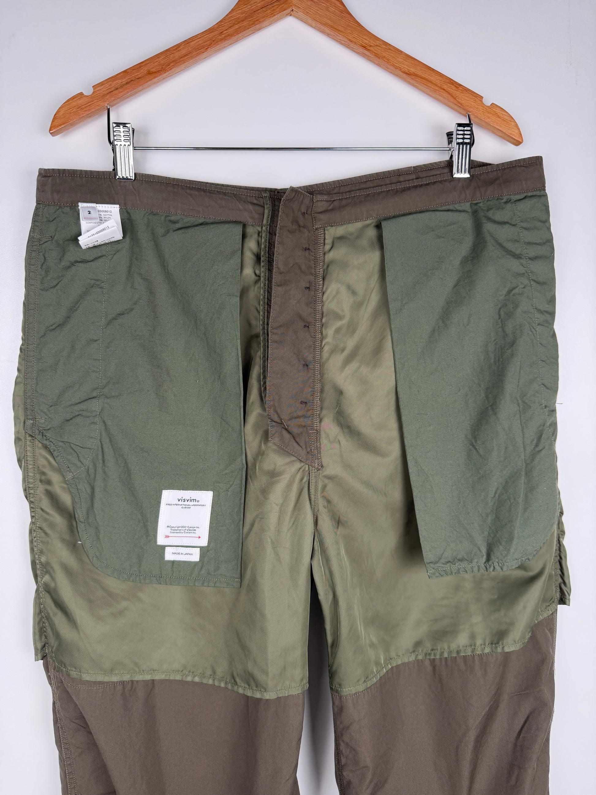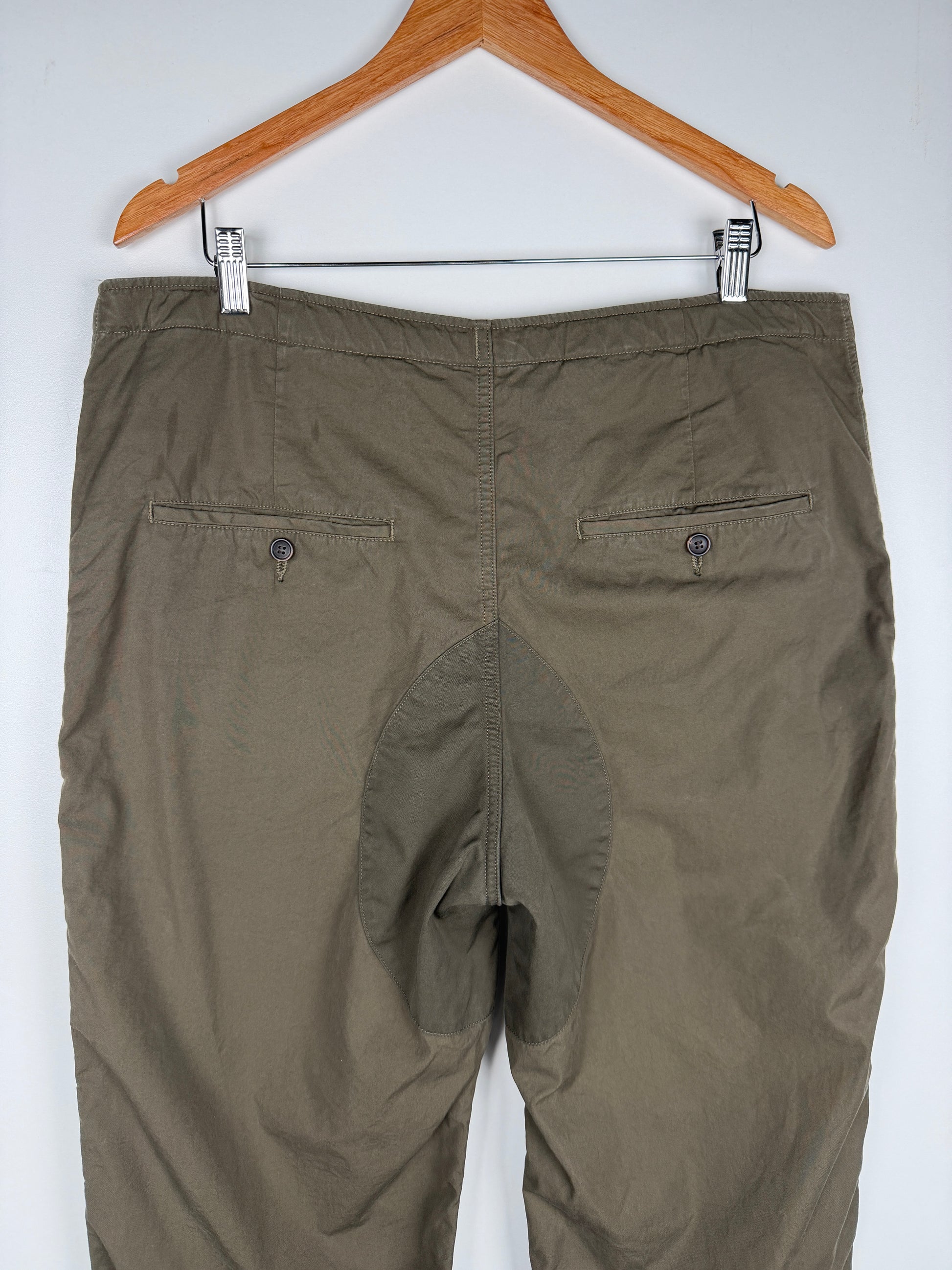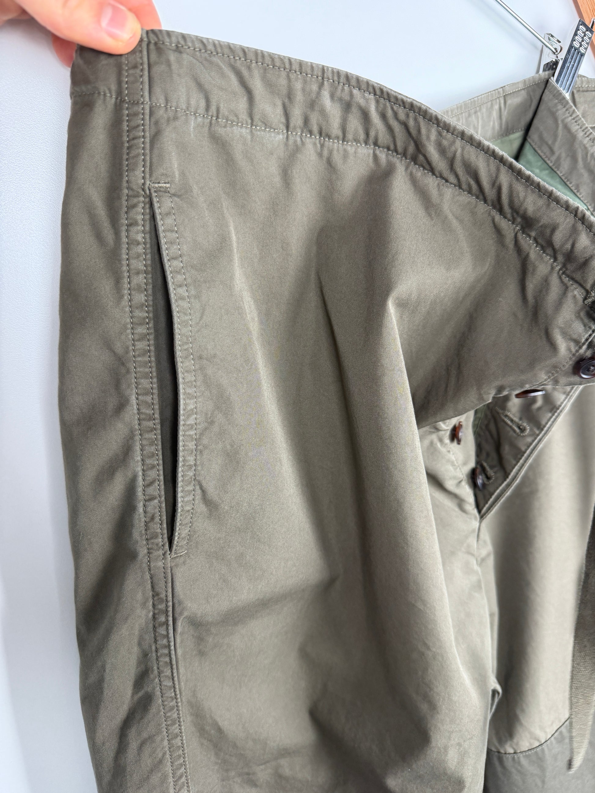 The pants are constructed using a custom densely woven cotton-nylon blend fabric. The pants are partially lined in a nylon fabric. Once constructed the pants were damage processed and mud overdyed for a unique finish.
