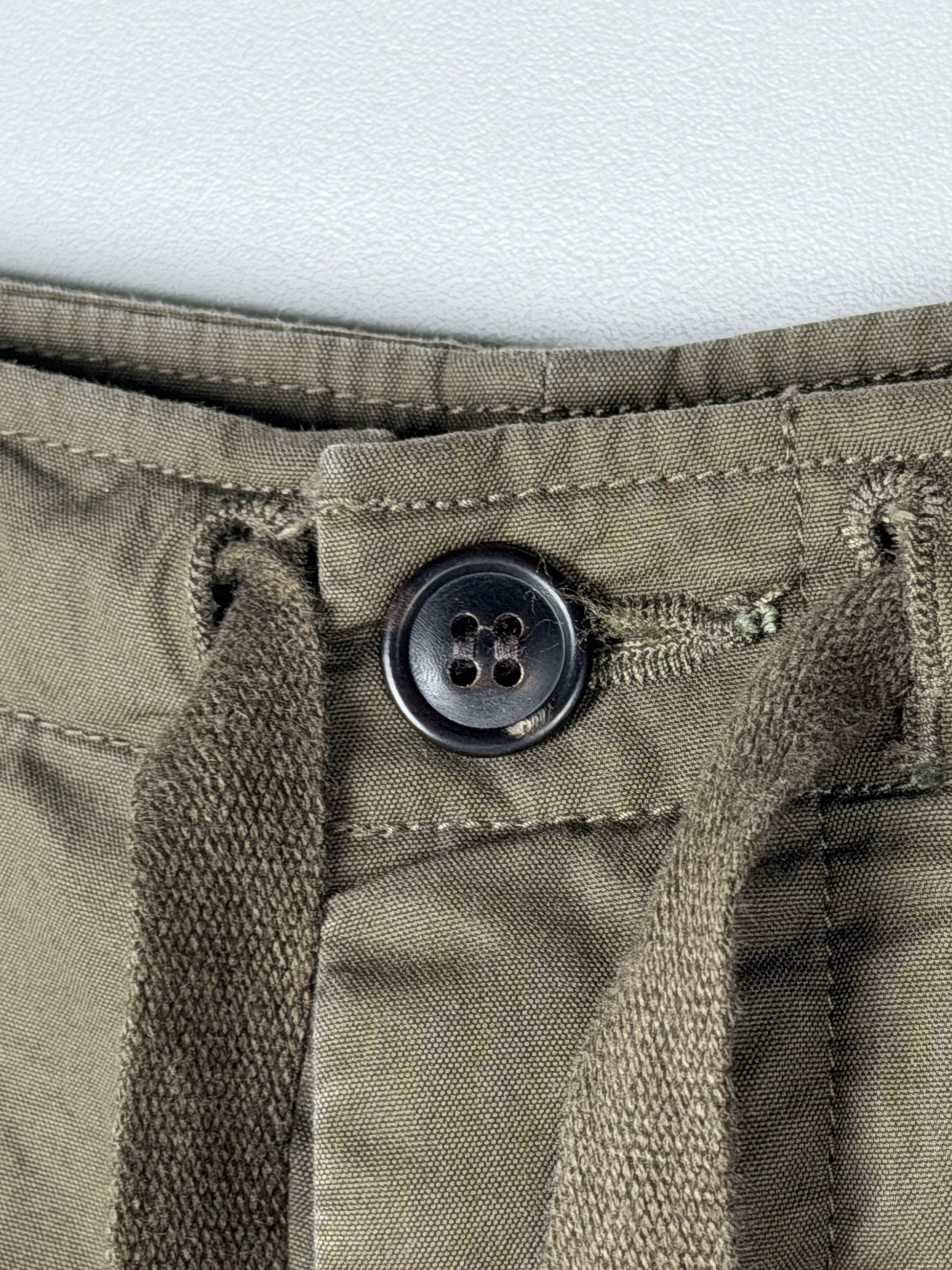 Additional details include a cotton-nylon blend fabric reinforcement along the knees and crotch, custom water buffalo horn buttons, and custom military tape drawstrings.