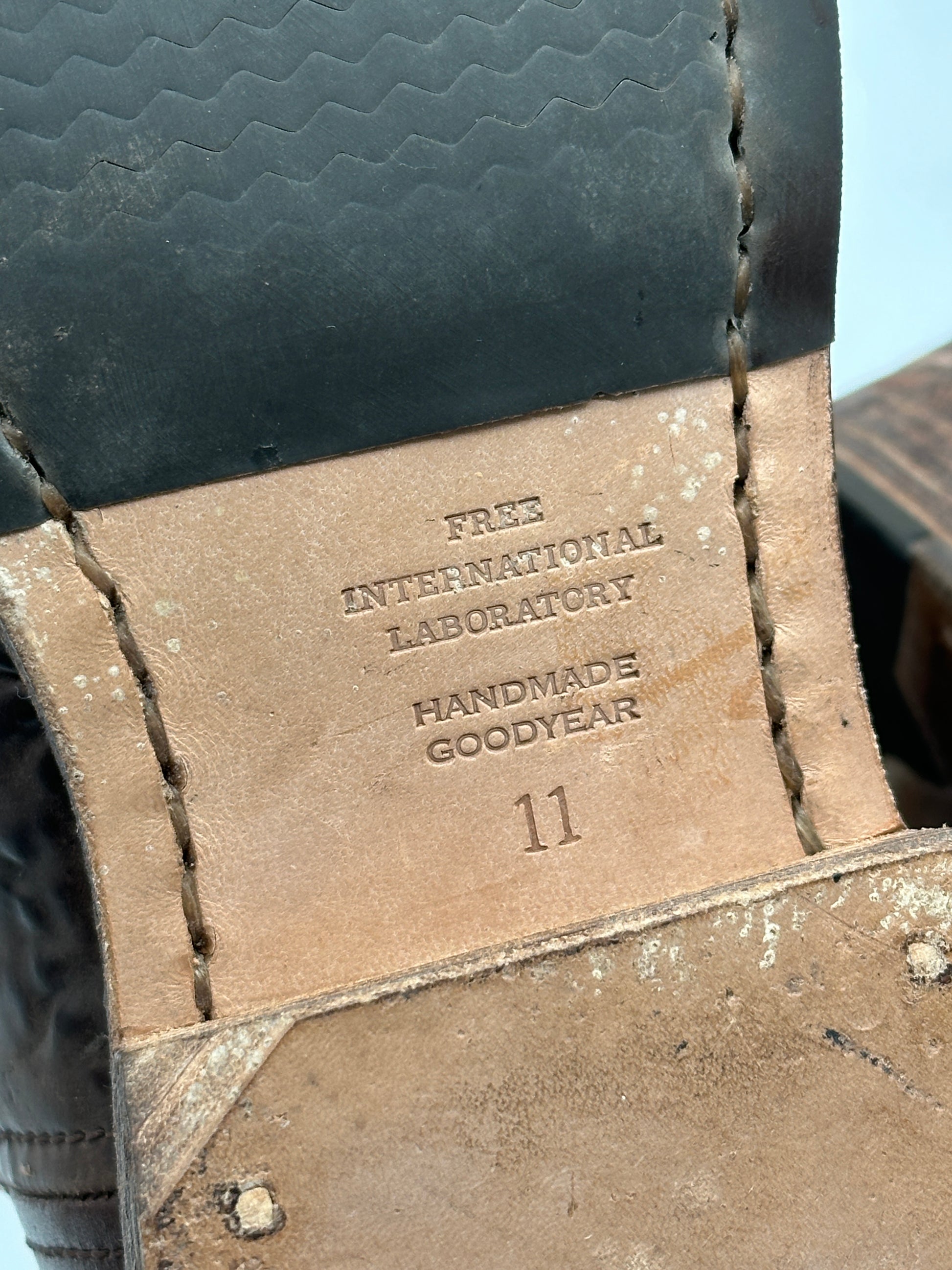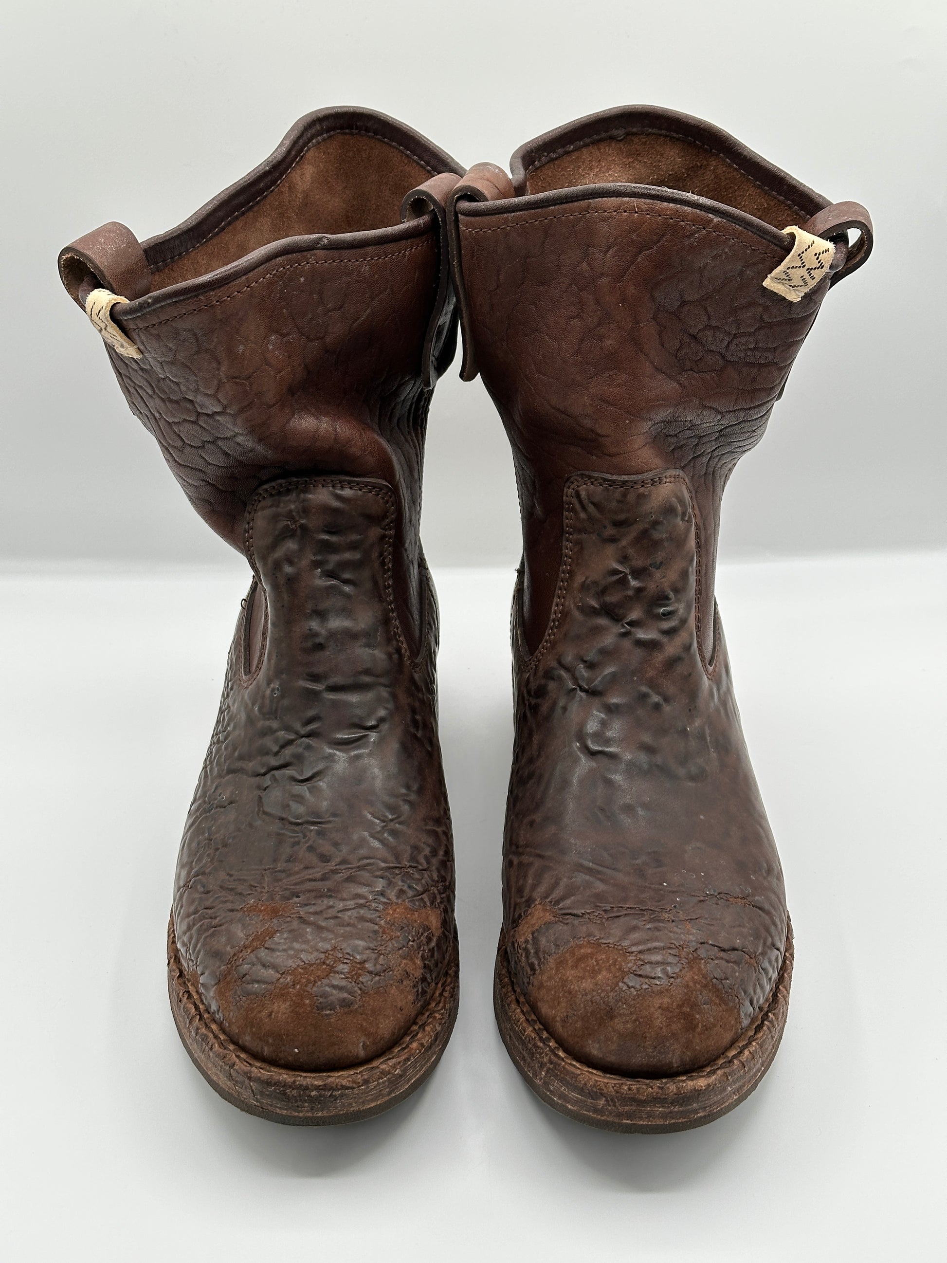 The boots are constructed using Italian Vegetable Tanned Horsehide uppers, stacked leather midsoles that have been damage processed for a worn-in look, and Vibram rubber outsoles that are hand-sewn to the uppers using a Goodyear leather welt construction. The leather chosen expresses an uneven texture with a lot of visible grain, which gives it a very unique expression where each iteration showcases individual differences.
